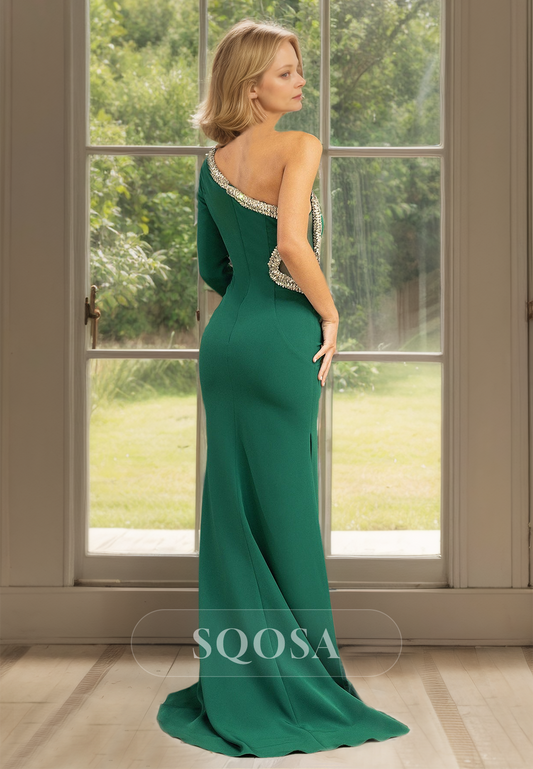 Beaded Asymmetrical-Neck One-Long-Sleeve Satin Mermaid Mother of the Bride Dress with Sweep Train