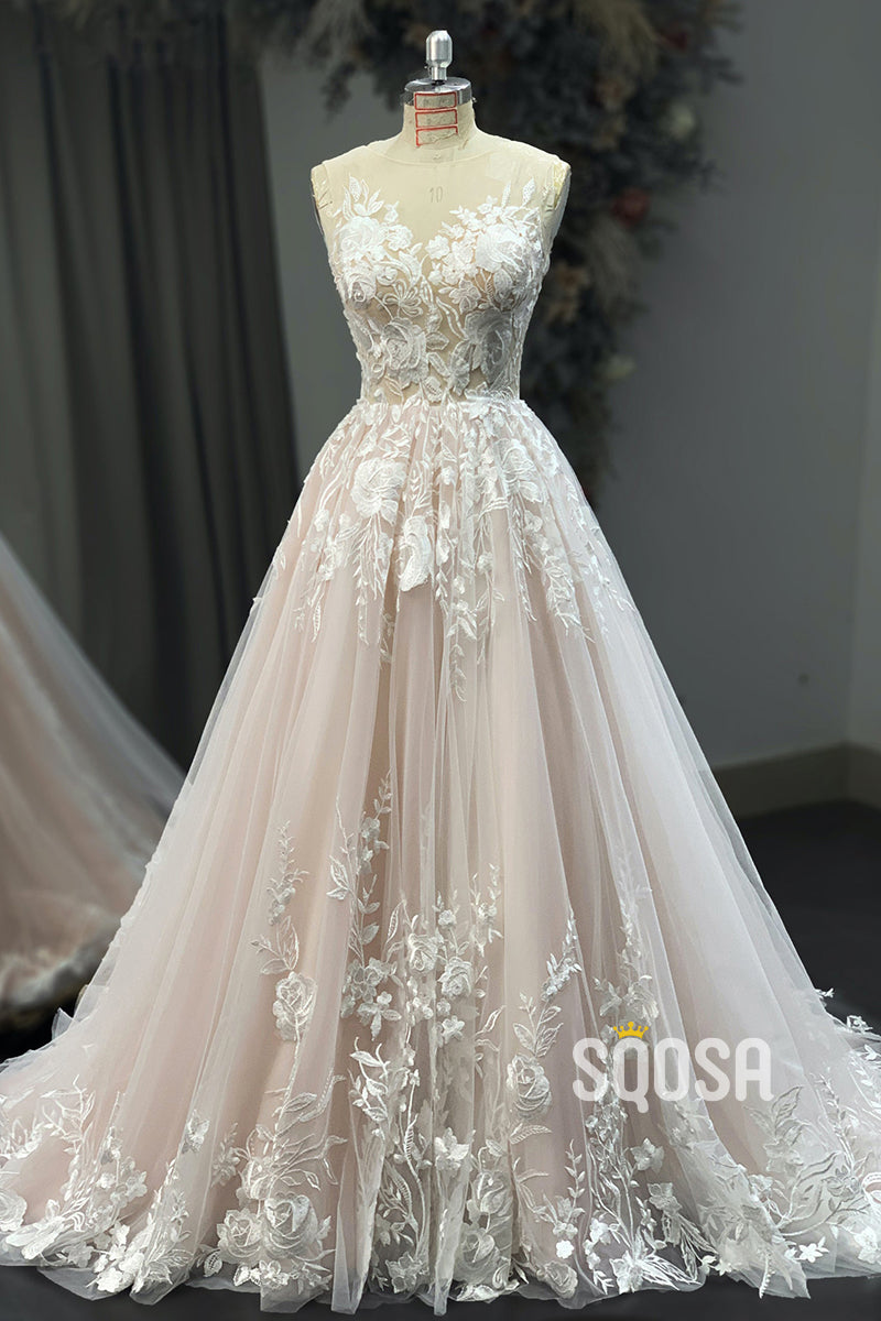 A-line Illusion Neckline Lace Appliques Rustic Wedding Dress Bridal Gown QW2185