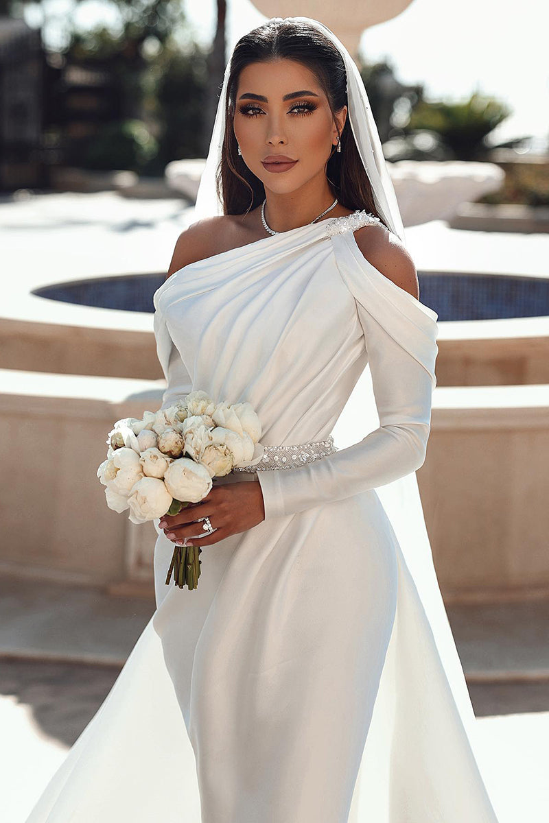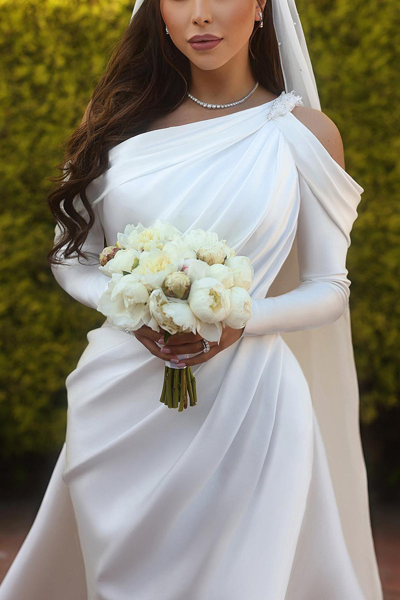 Unique One Shoulder Long Sleeves Satin Mermaid Wedding Dress