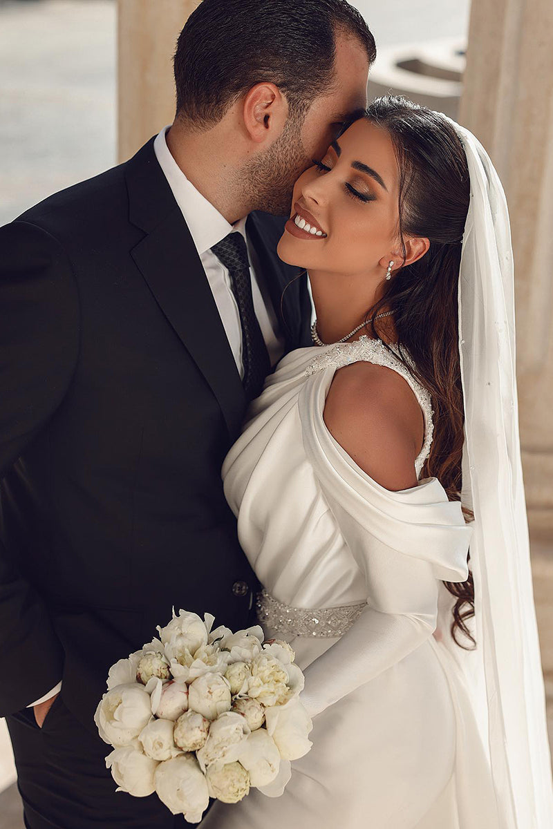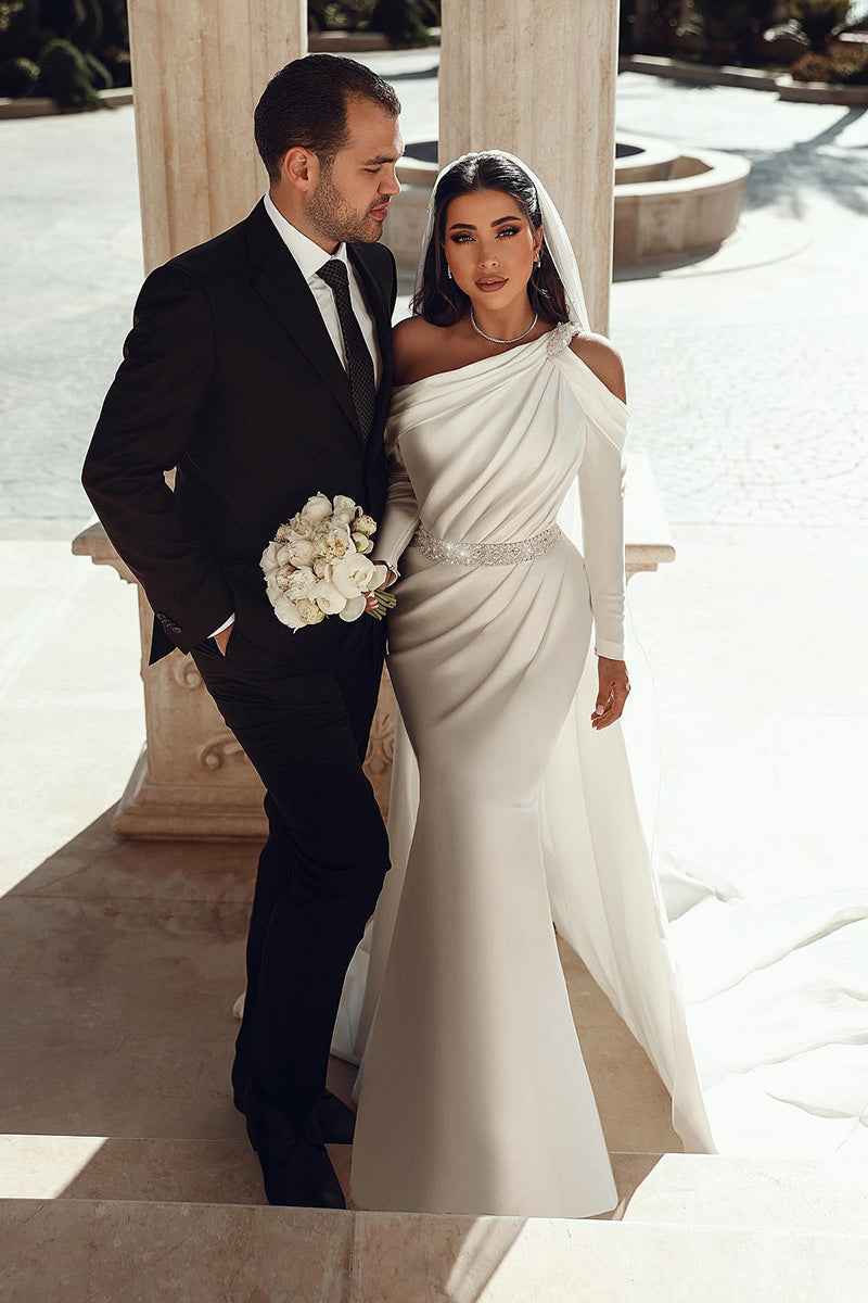 Unique One Shoulder Long Sleeves Satin Mermaid Wedding Dress QW0923