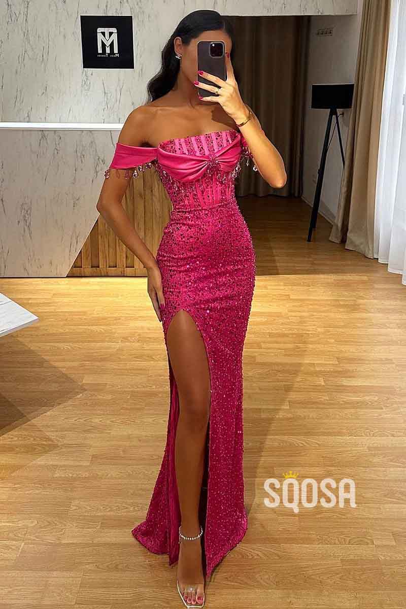 ASheath/Column Pff Shoulder Side Slit Long Prom Party Dress QP2347