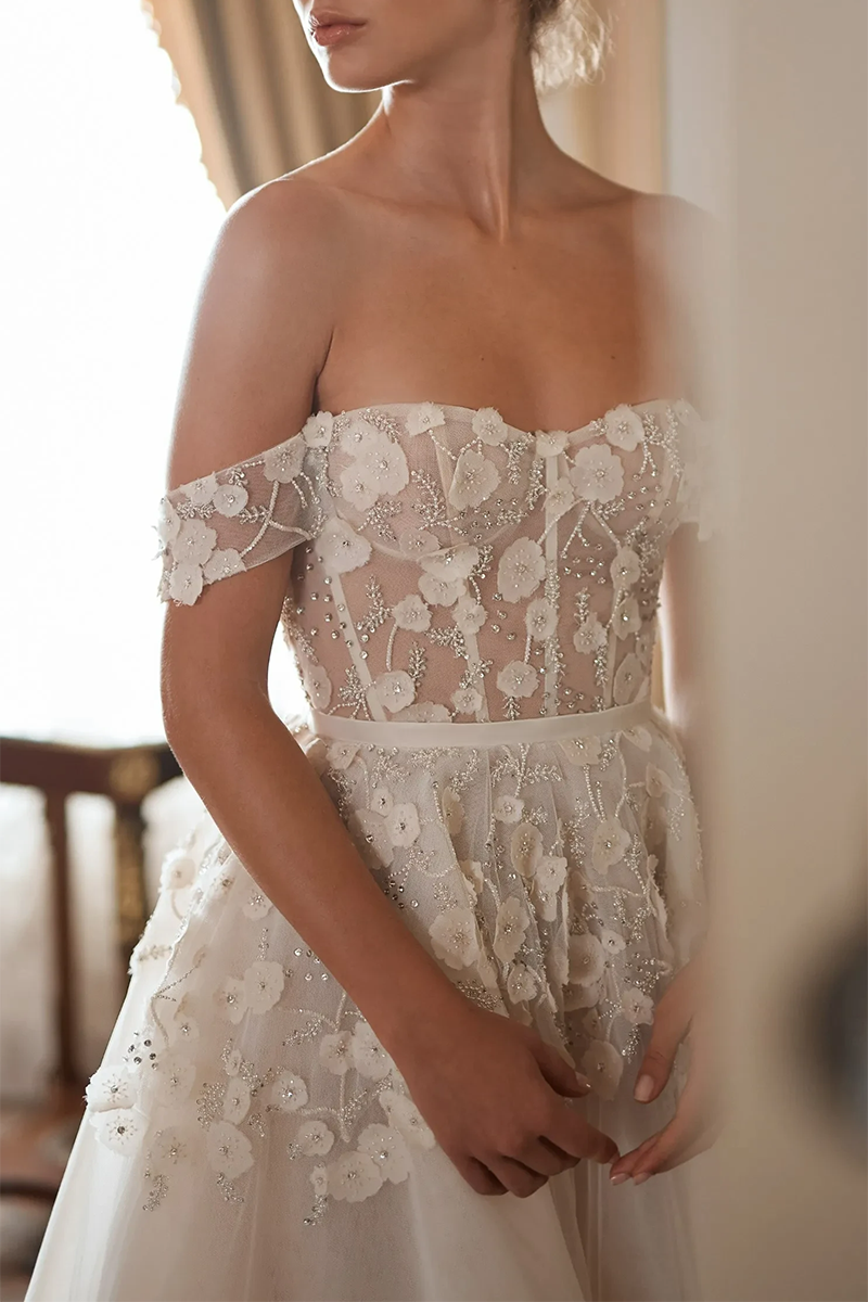 A Line Sweetheart Appliques Rustic Wedding Dress with Court Train