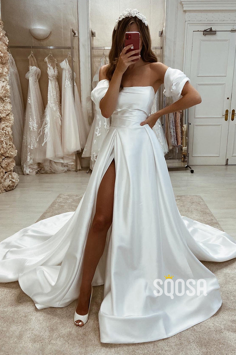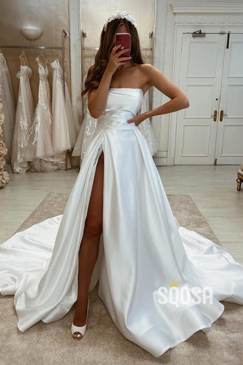 A-line Strapless Pleats Satin Wedding Dress with Slit QW0911