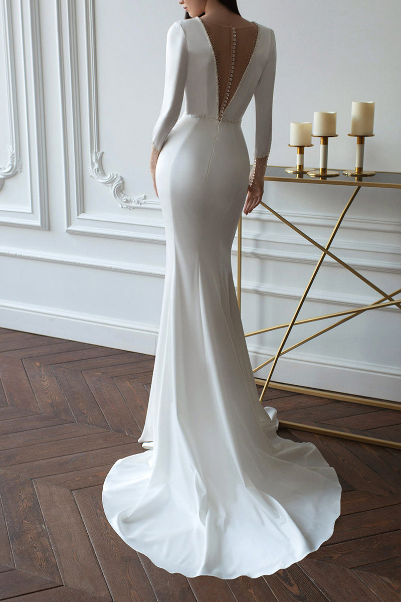 Sheath/Column Illusion Deep V neck Long Sleeve Satin Wedding Dress with Court Train