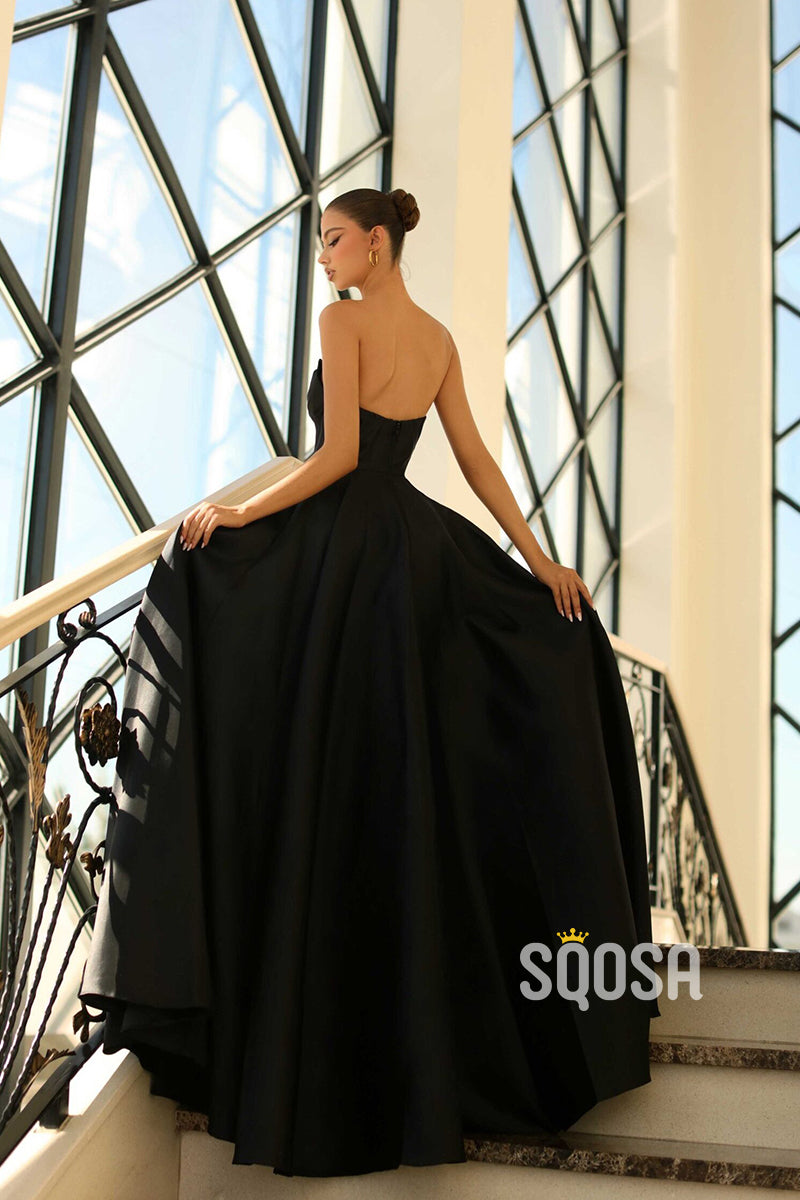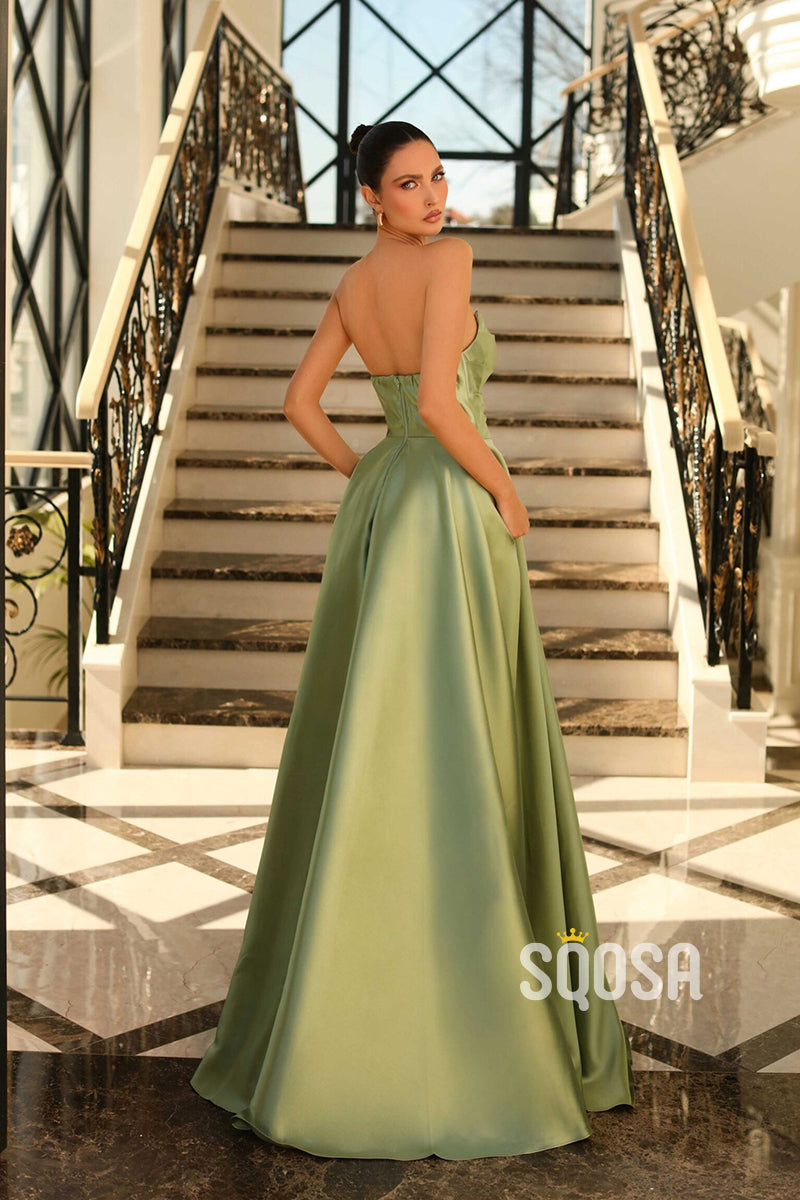 A Line Strapless Satin Pleats Long Prom Formal Dress with Pockets QP1081