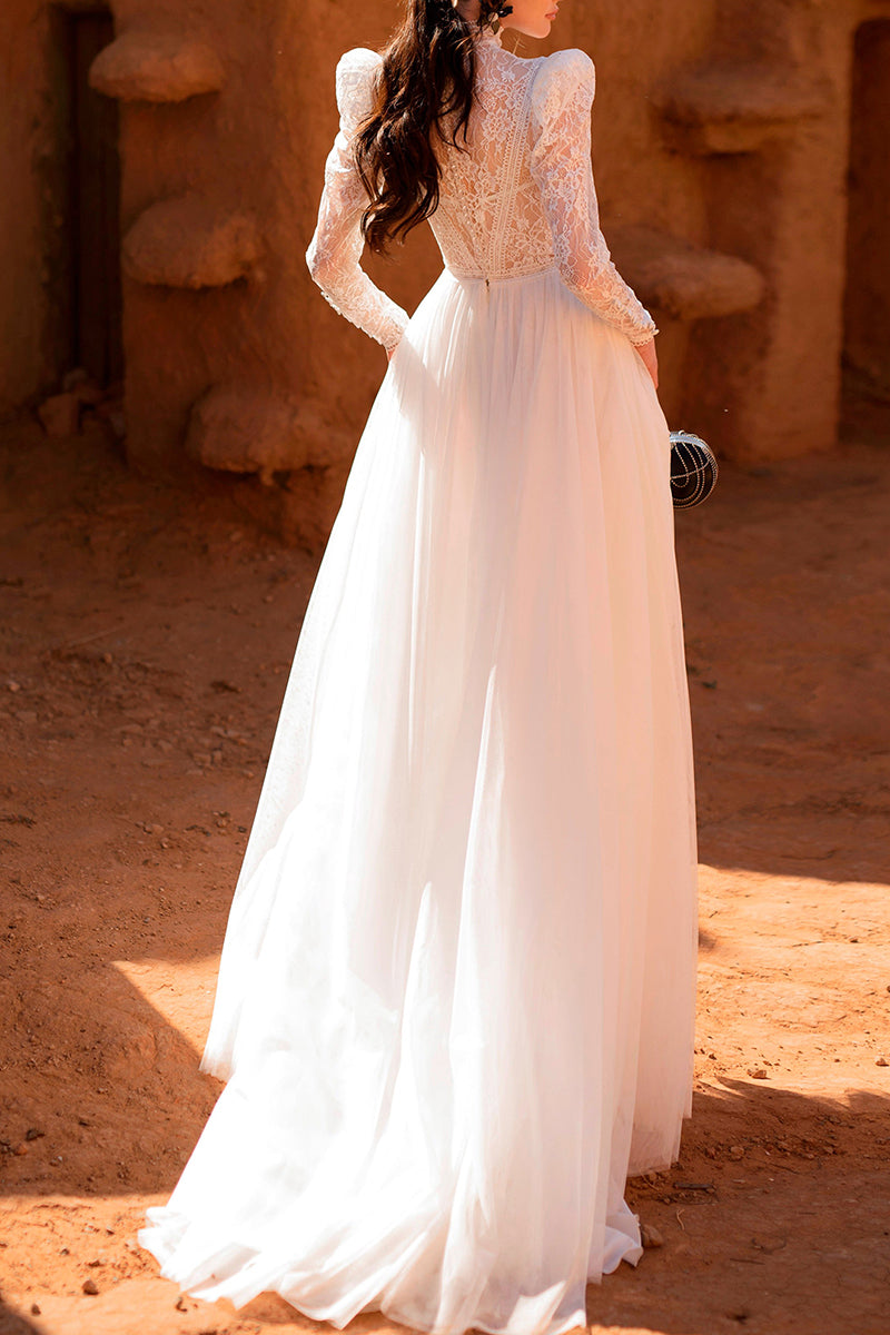 A line Muslim High Neck Lace Long Sleeves Vintage Wedding Dress