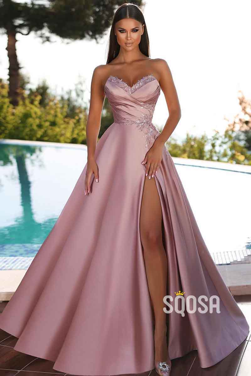 A Line V neck Satin Appliques Elegant Long Prom Party Dress with Slit QP1396