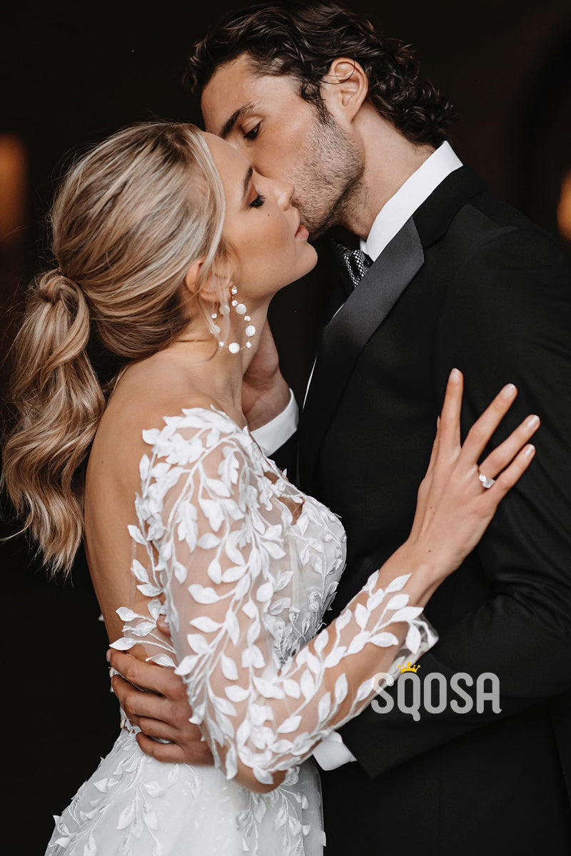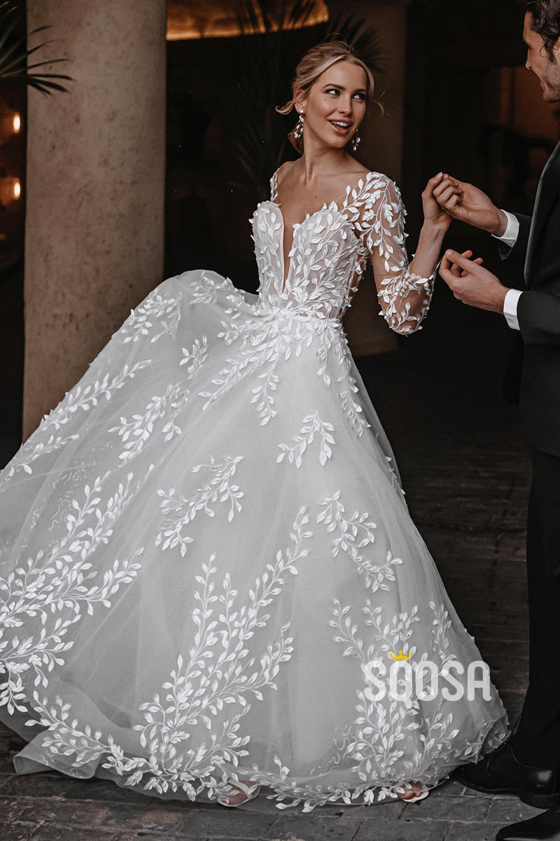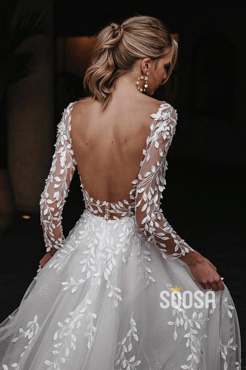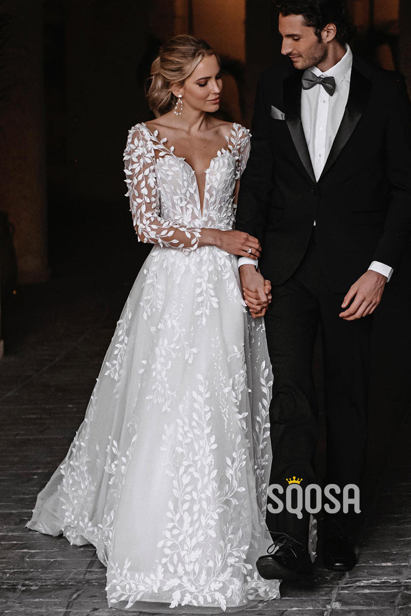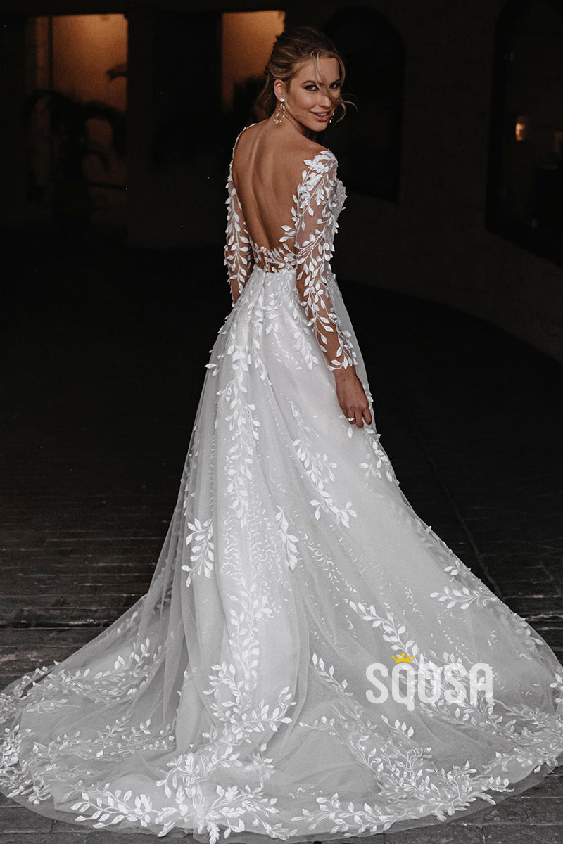 Attractive V-Neck Lace Appliques Long Sleeves Rustic Wedding Dress QW0821