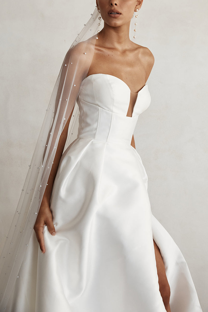 A line V Neck Side Slit Satin Simple Wedding Dress Bridal Gown QW0902