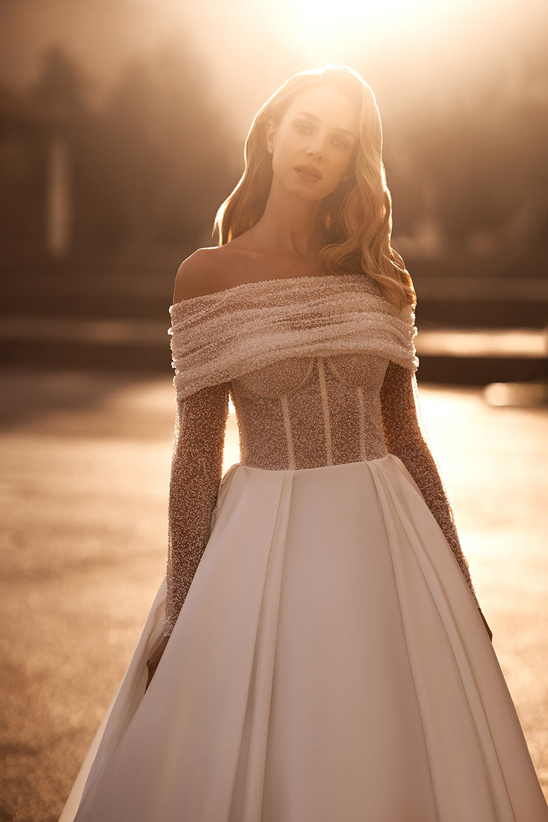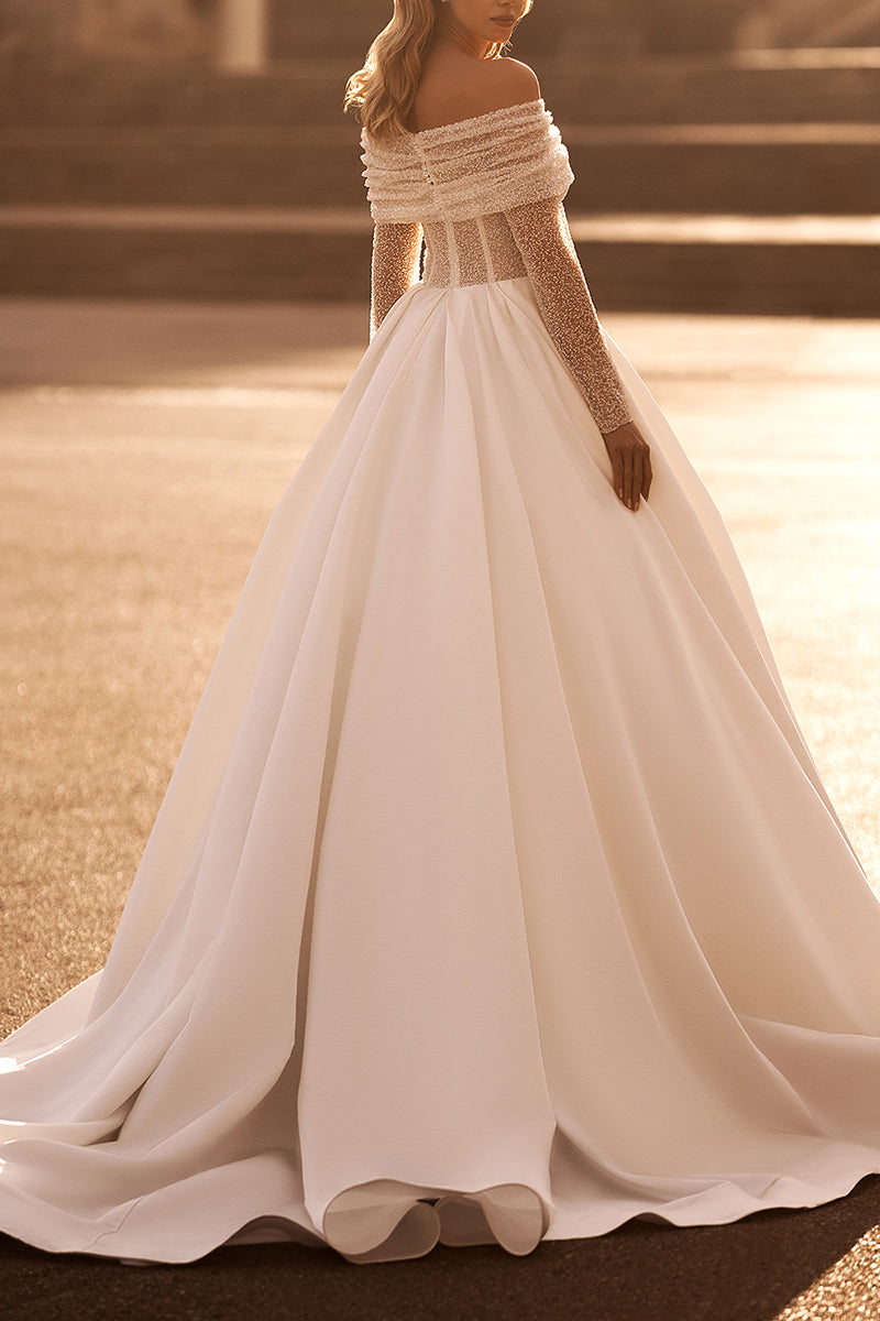AA line Off the Shoulder Long Sleeves Rustic Wedding Dress with Court Train QW0850