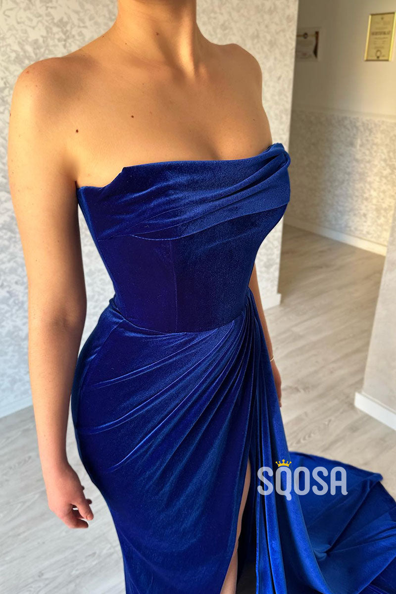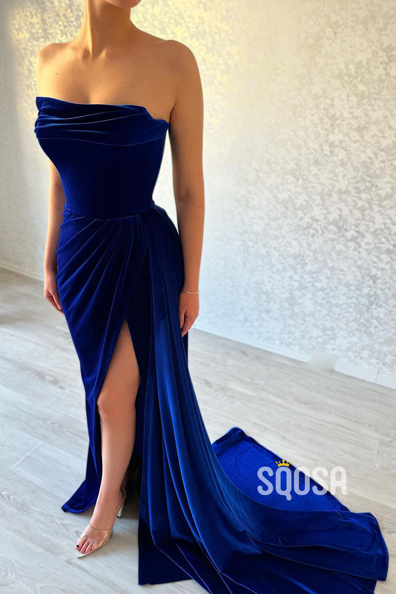 Royal Blue Strapless Velvet Pleats Long Train Split Sexy Prom Dress Party Gown QP0828