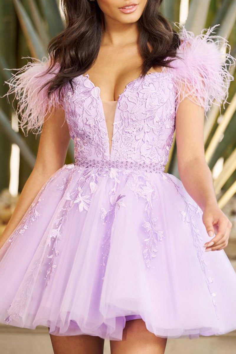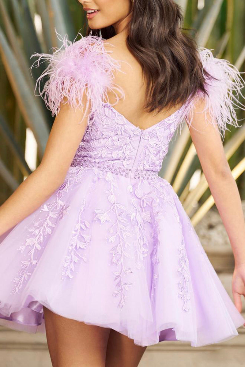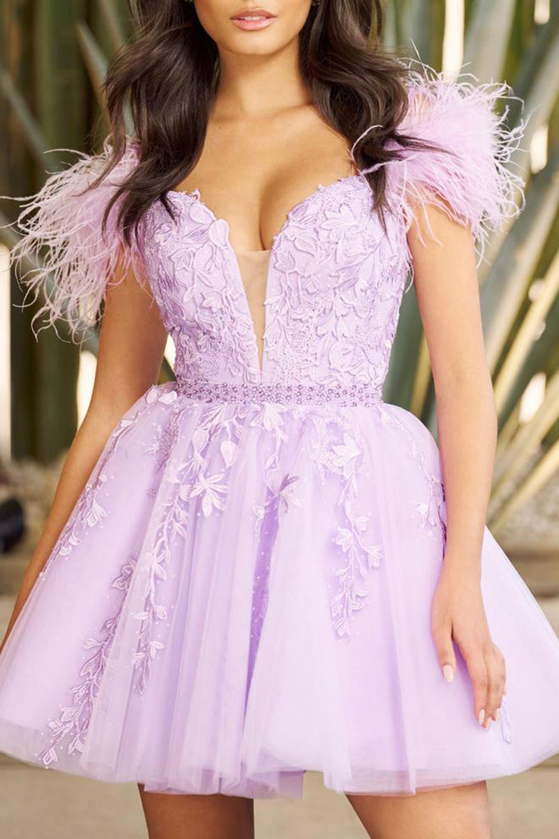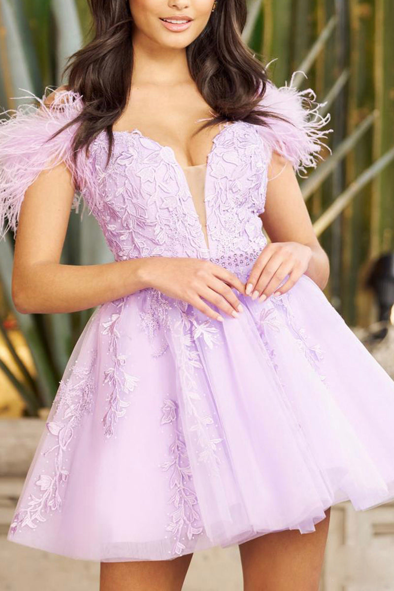 A Line Illusion V Neck Appliques Lilac Short Homecoming Dress