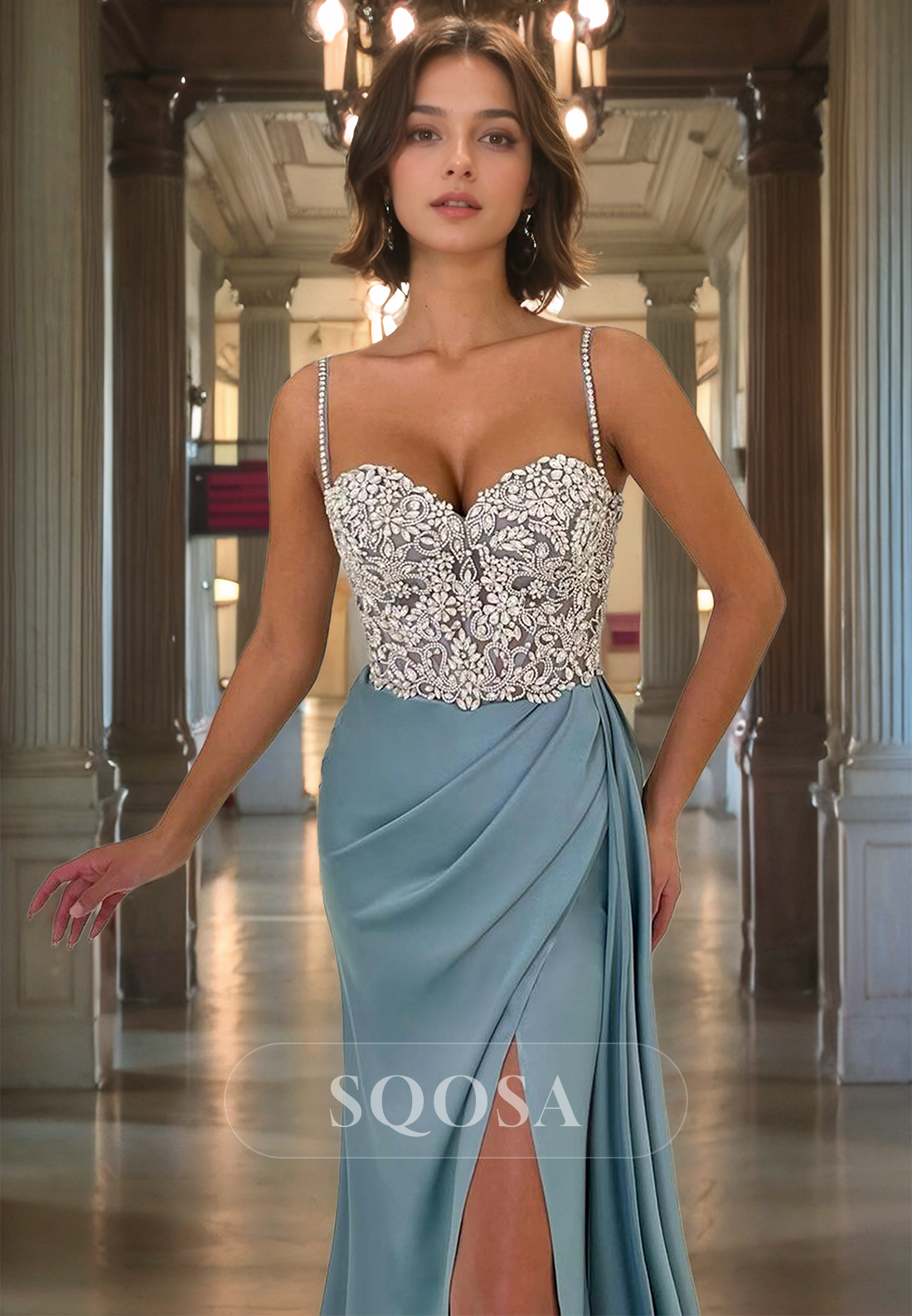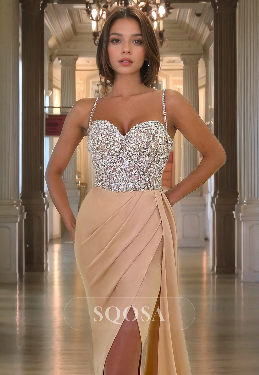 Sweetheart Spaghetti Straps Pleated Prom Dress Blouson Beaded Mermaid Formal Dress