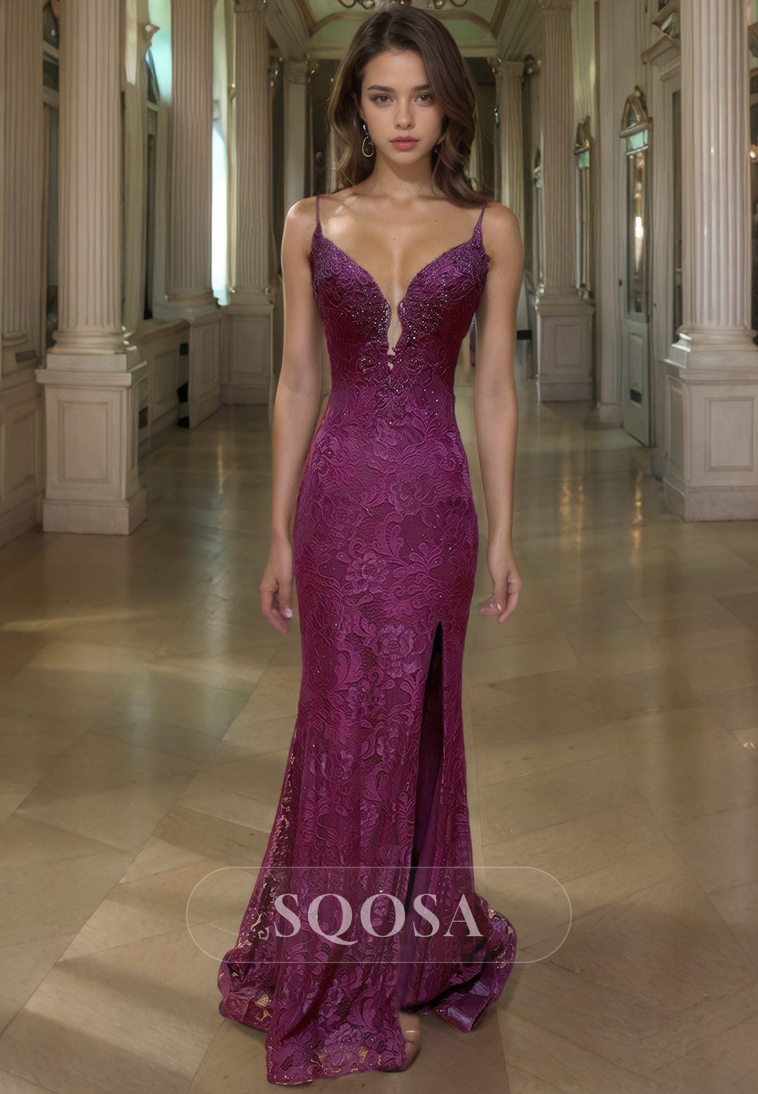 Plunging V Neck Appliques Lace Mermaid Prom Dress with Slit Long Formal Dress
