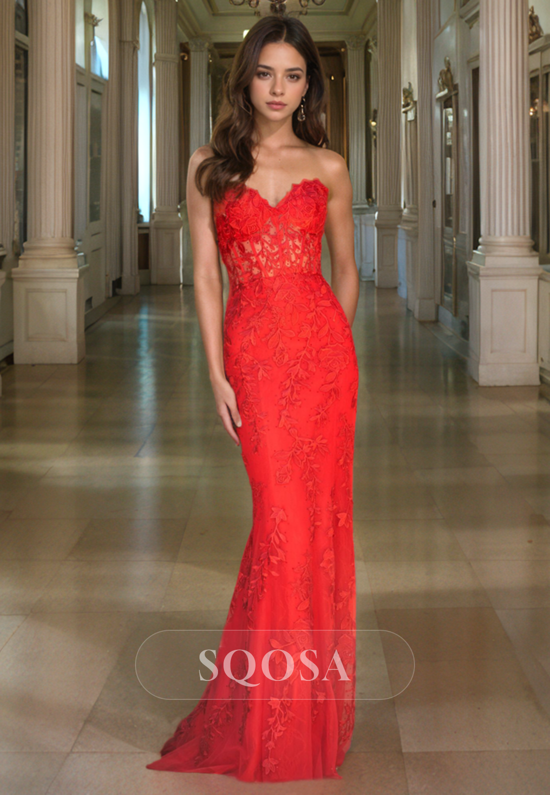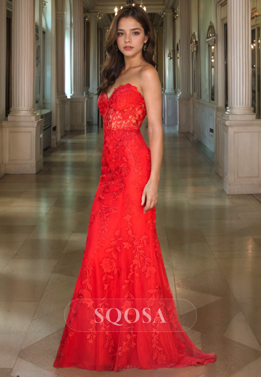 Sheath Sweetheart Lace Appliques Red Prom Dress Long Graduation Dress