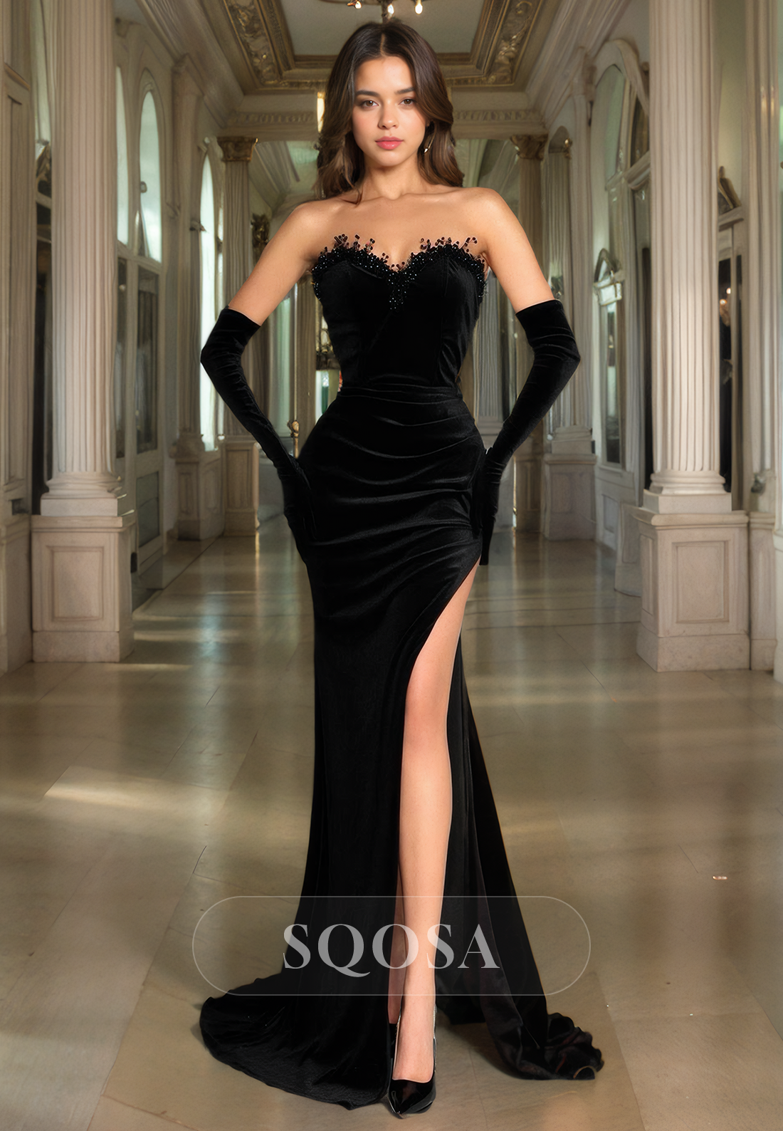 Enhance your elegance with our Sheath Sweetheart Beads Black Velvet Long Prom Dress. The sleek silhouette and subtle beading create a stunning look, while the slit adds a touch of modernity. Perfect for a formal event, this dress will make you stand out from the crowd.