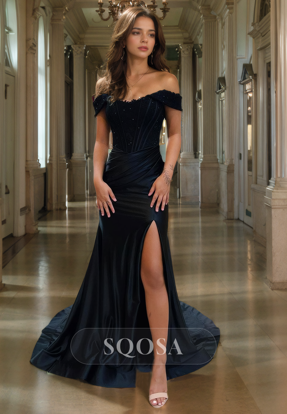 Expertly crafted with lace appliques and an off-shoulder design, this mermaid prom dress exudes elegance. The form-fitting silhouette is complemented by a thigh-high slit for added allure. Perfect for formal occasions, this gown is sure to make a statement.