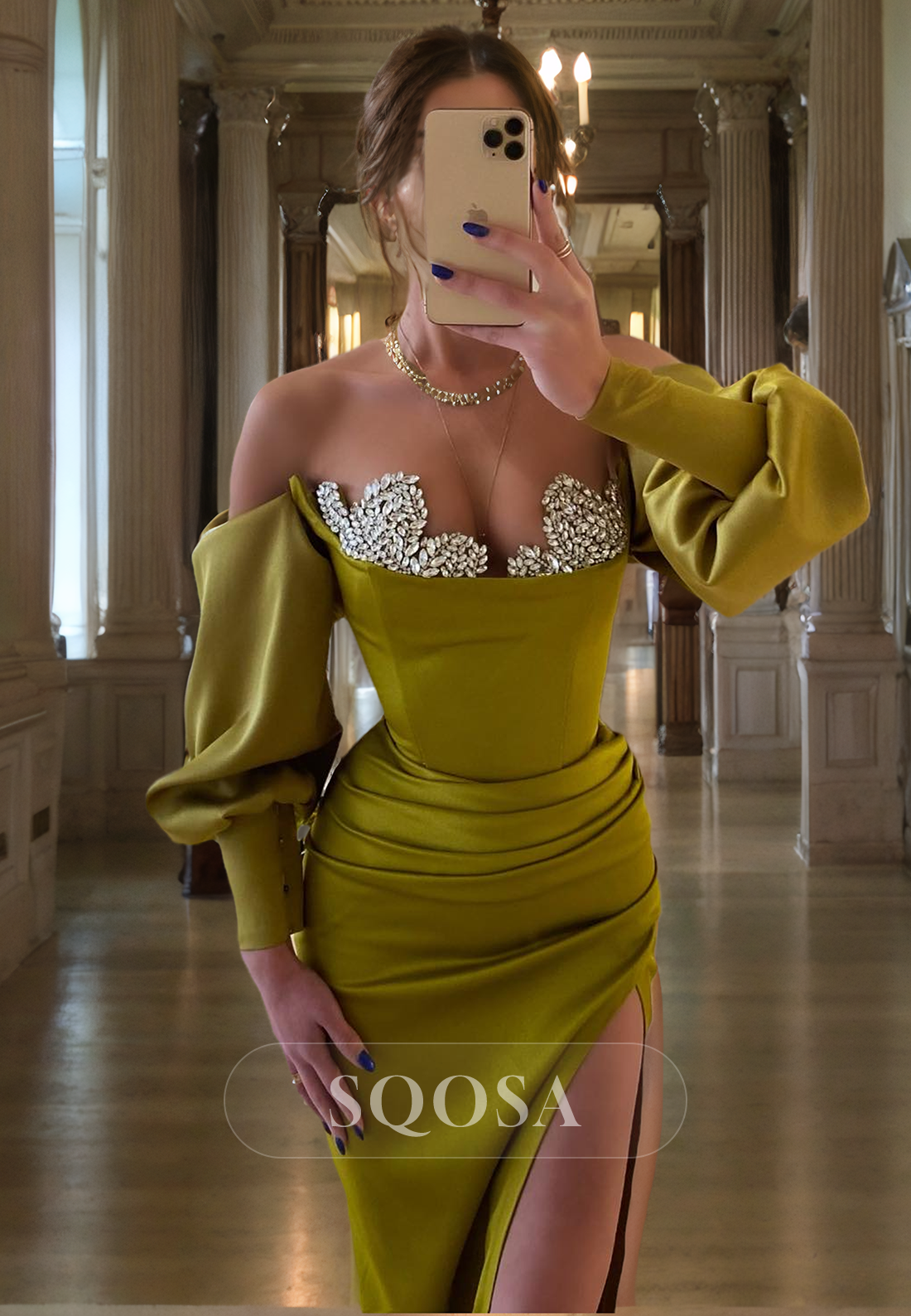 Sheath Off Shoulder Beads Pleats Long Sleeve Prom Dress with Slit Forma