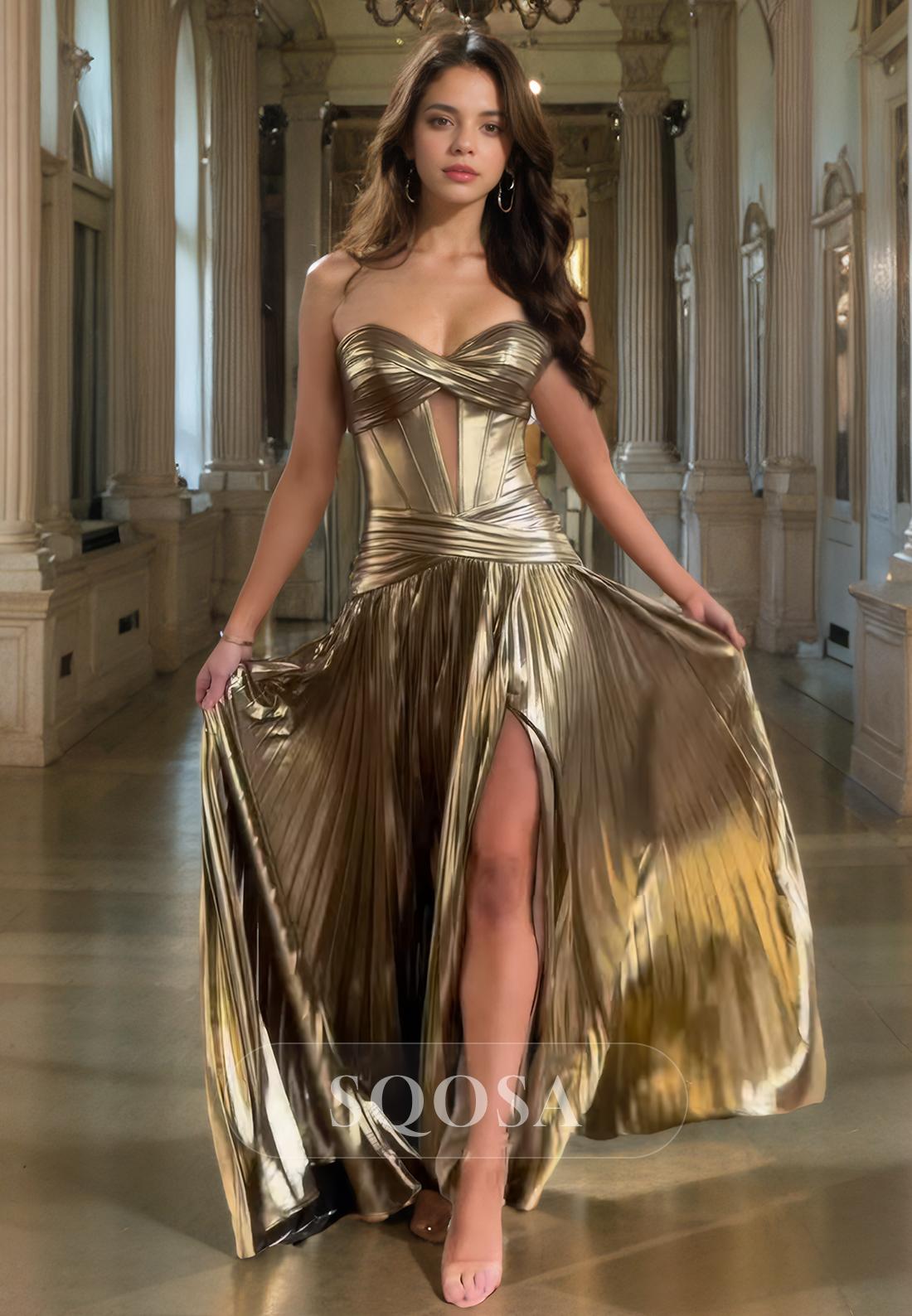 A Line Sweetheart Ruched Side Slit Gold Prom Dress