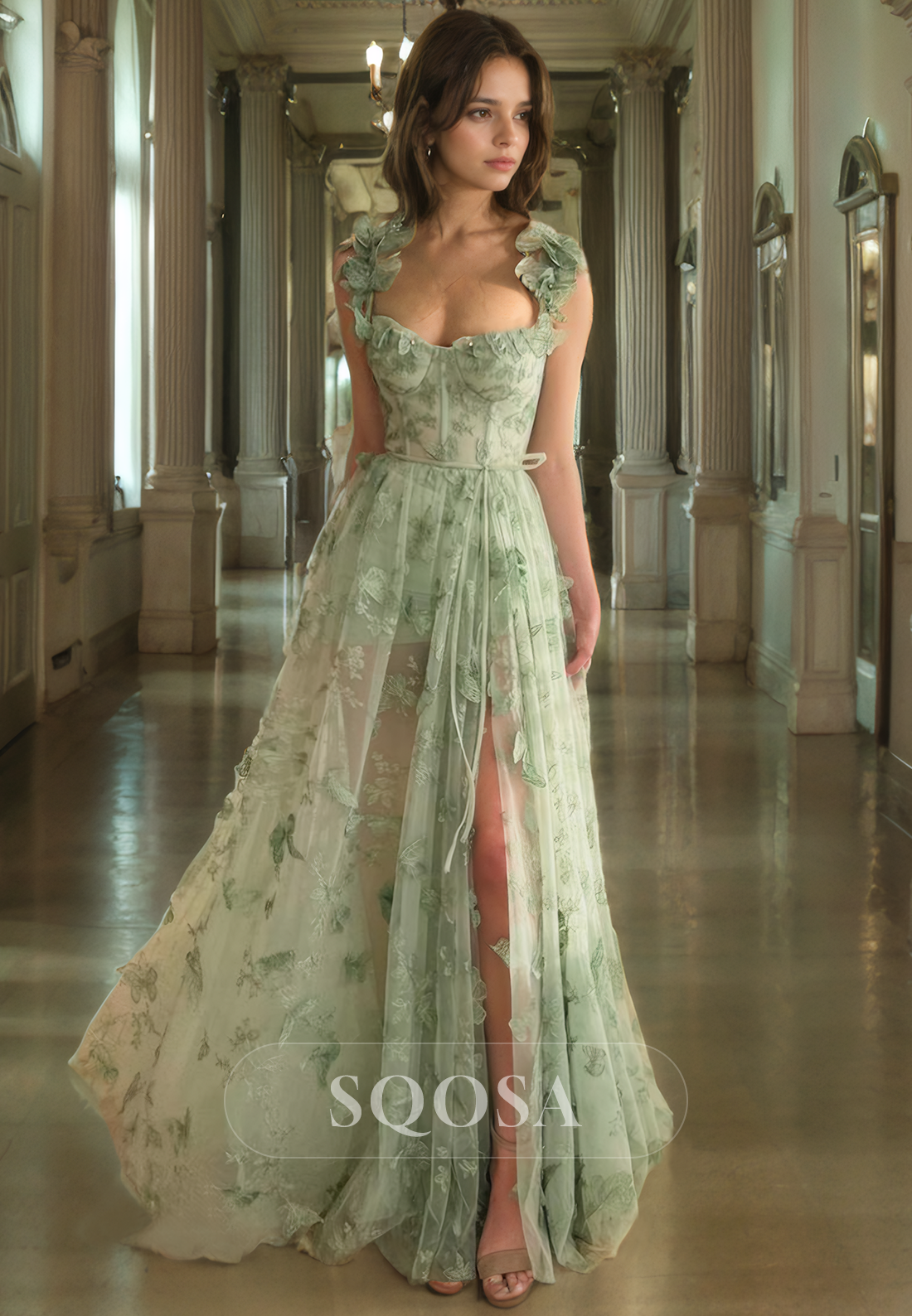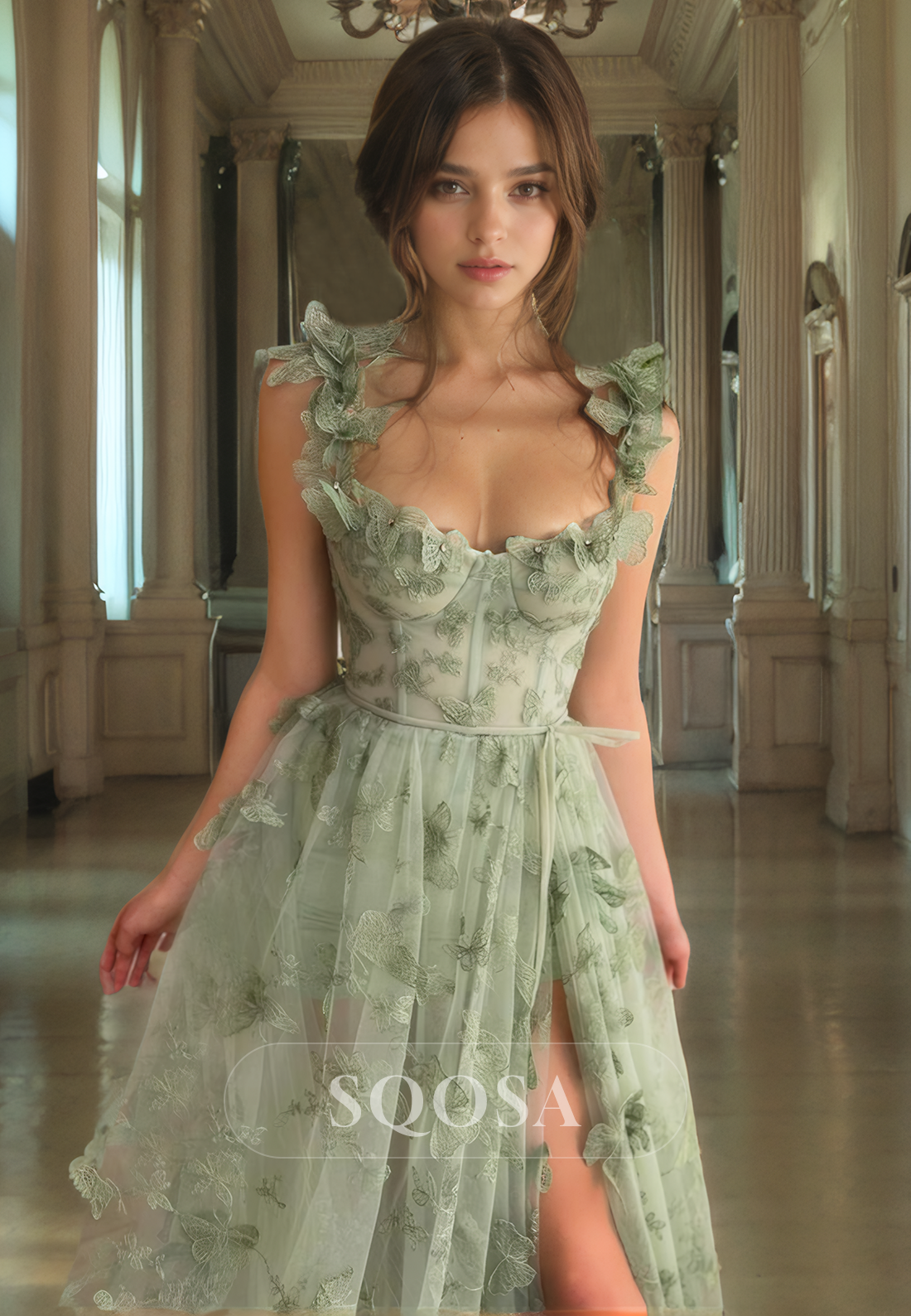 A Line Sweetheart Butterfly Lace Prom Dress with Slit Long Party Dress