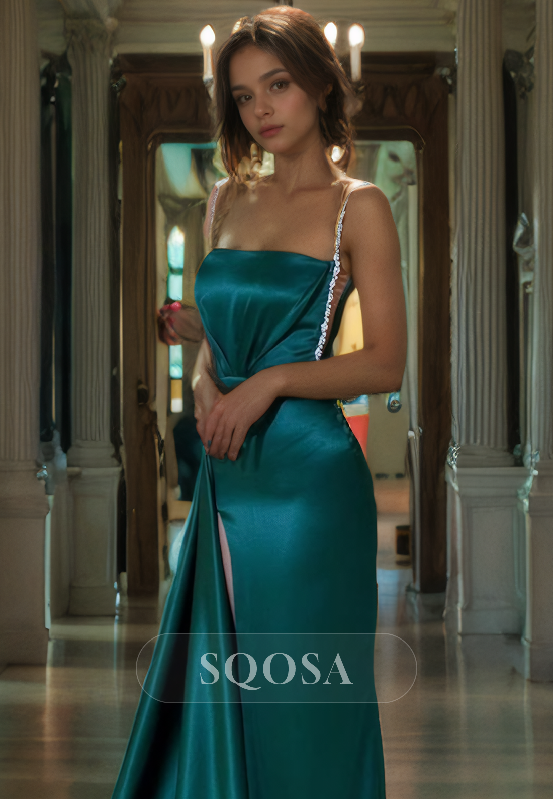 Spaghetti Straps Square Long Prom Dress with Slit Formal Gown
