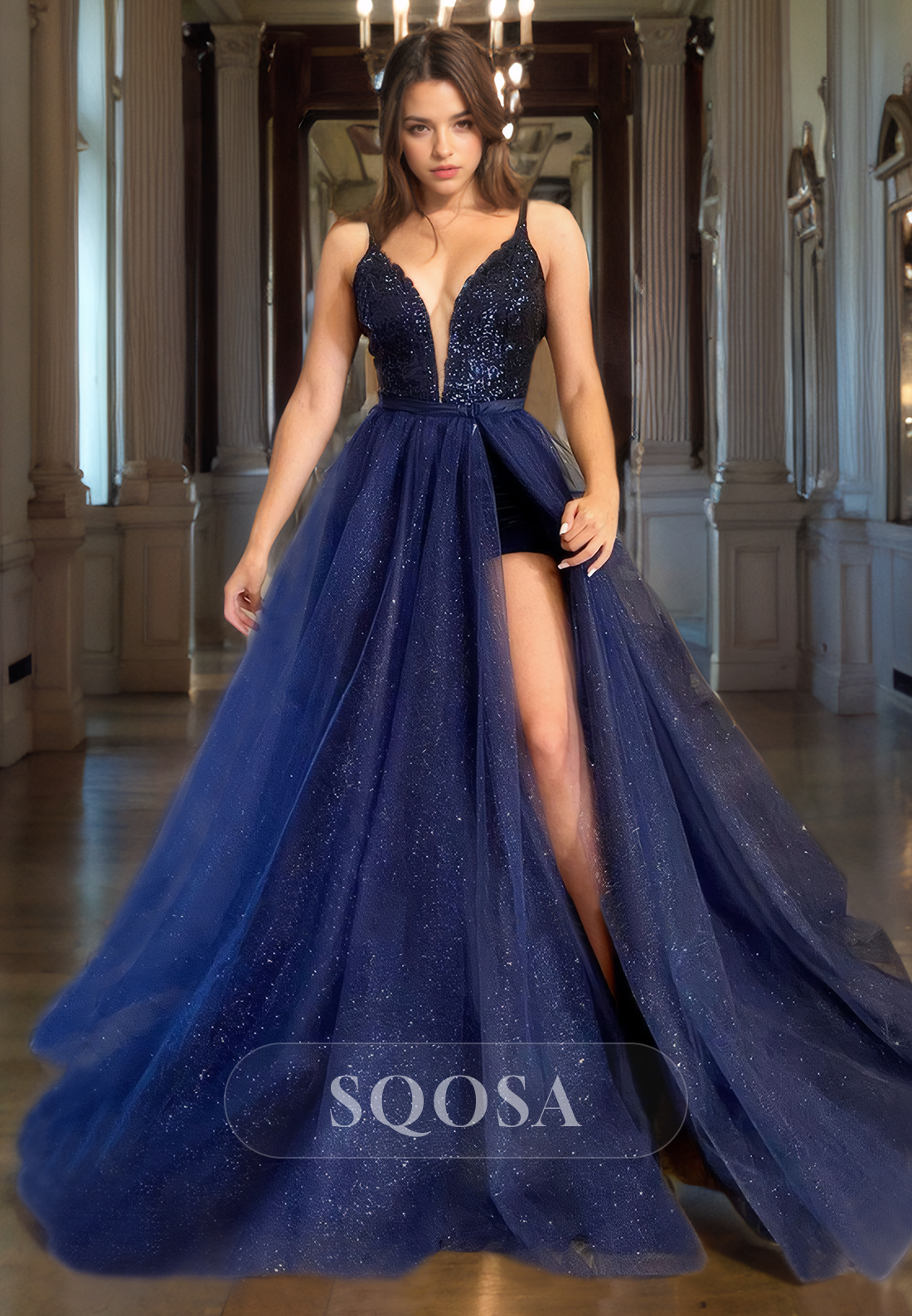Plunging V Neck Overskirt Long Prom Dress with Slit Formal Party Gown