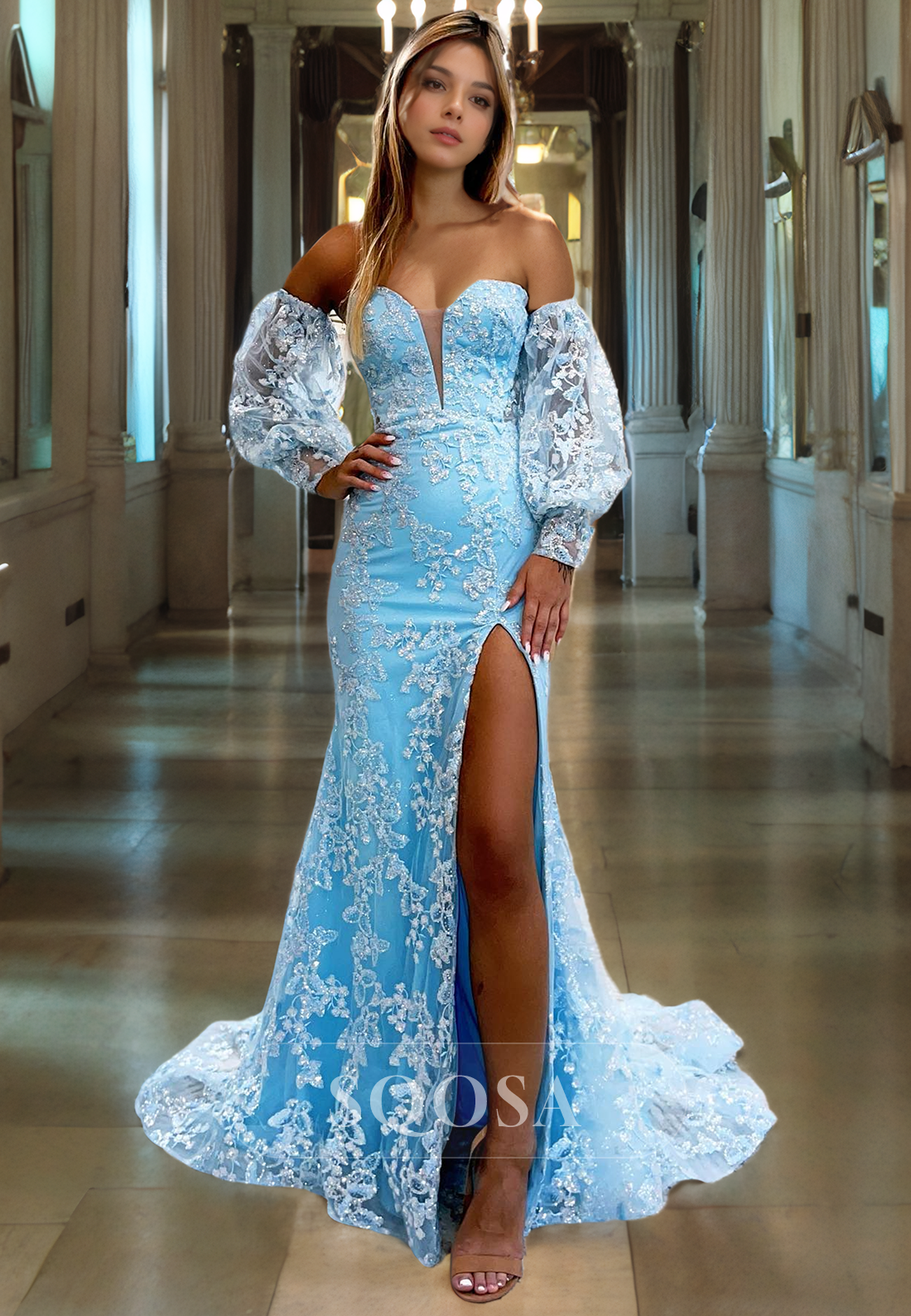 Plunging V Neck V Neck Long Sleeves Lace Mermaid Prom Dress with Slit Party Gown