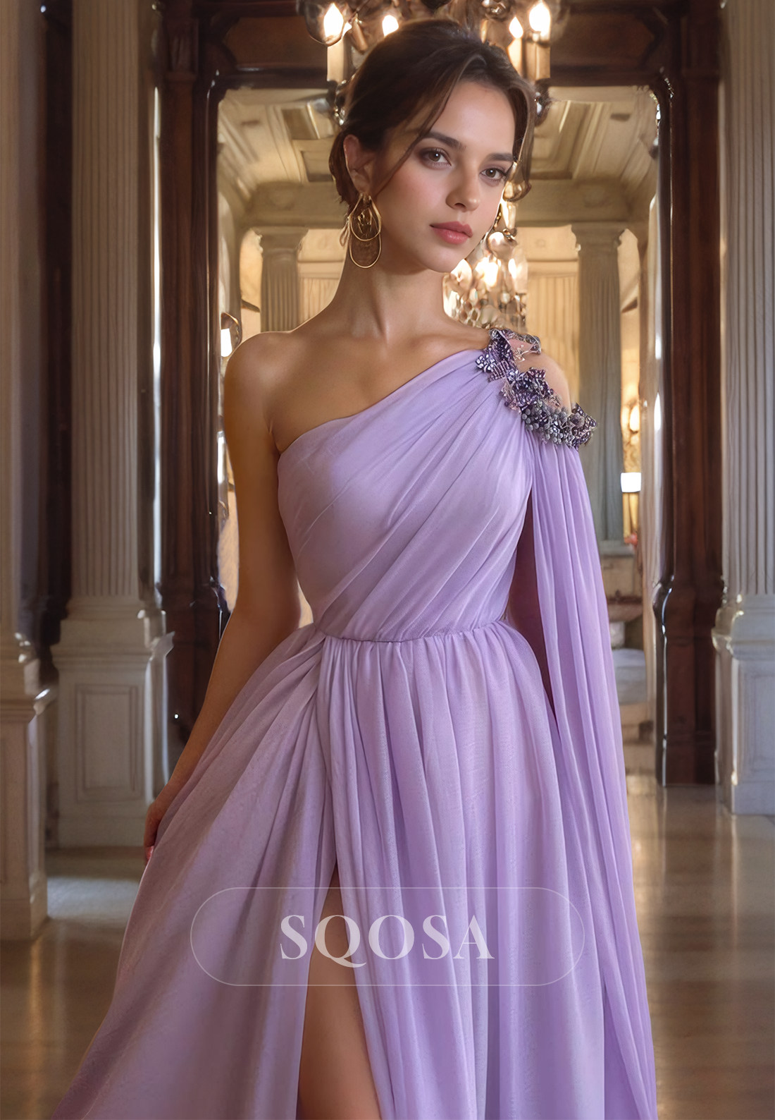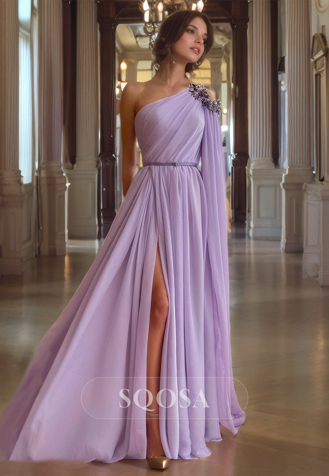 A Line One Shoulder Chiffon Beads Long Prom Dress with Slit Formal Party Gown