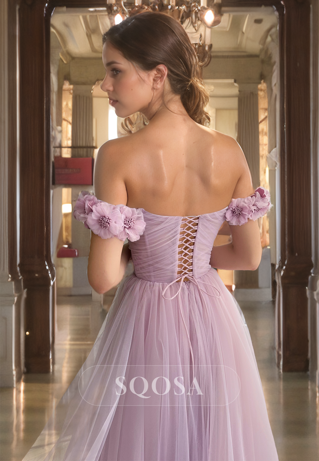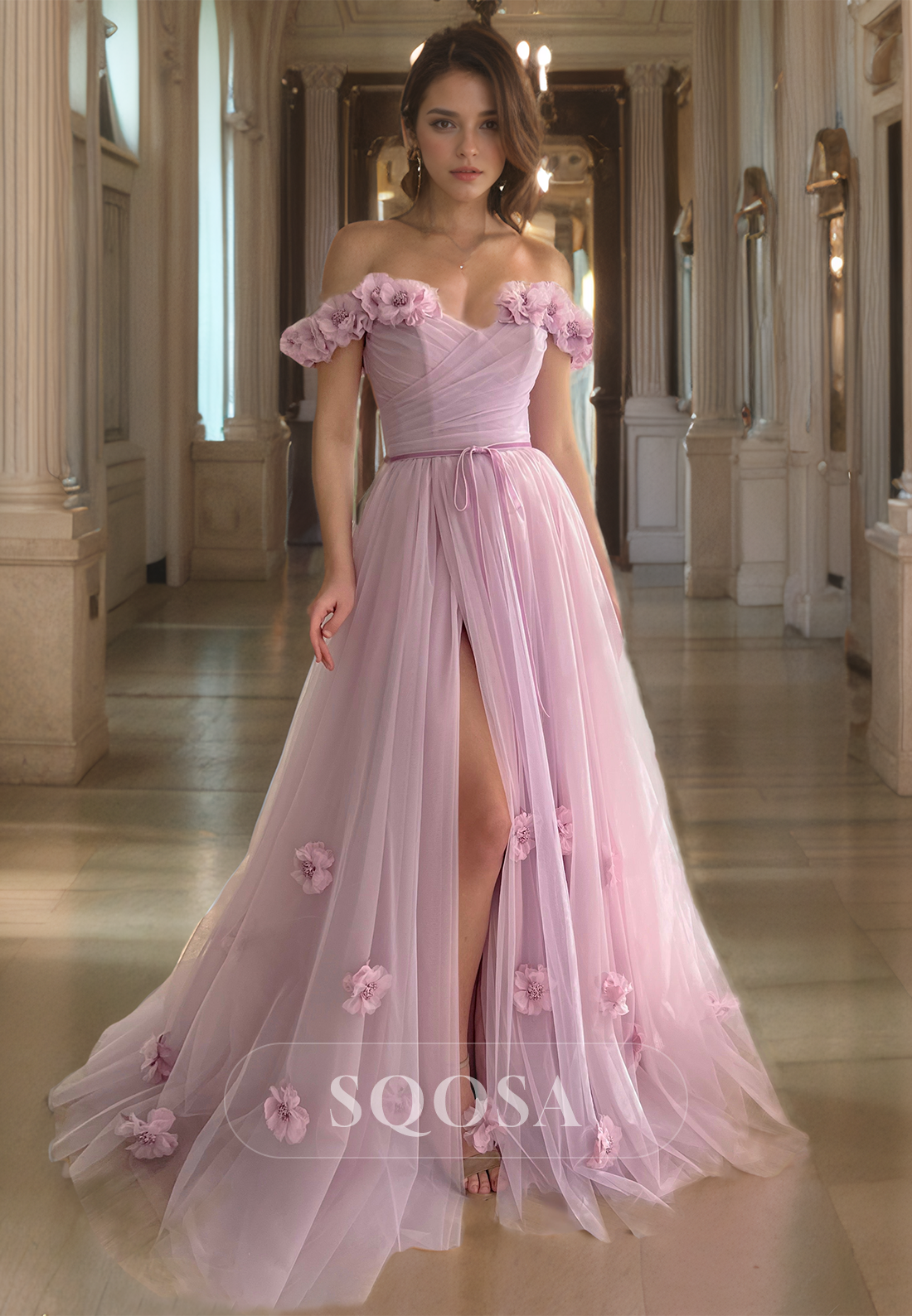 This off shoulder prom dress boasts stunning 3D flower embellishments and a flattering A-line silhouette with a thigh-high slit. Perfect for formal parties and special occasions, this gown exudes elegance and sophistication. Made with high-quality materials for a comfortable and stylish fit.