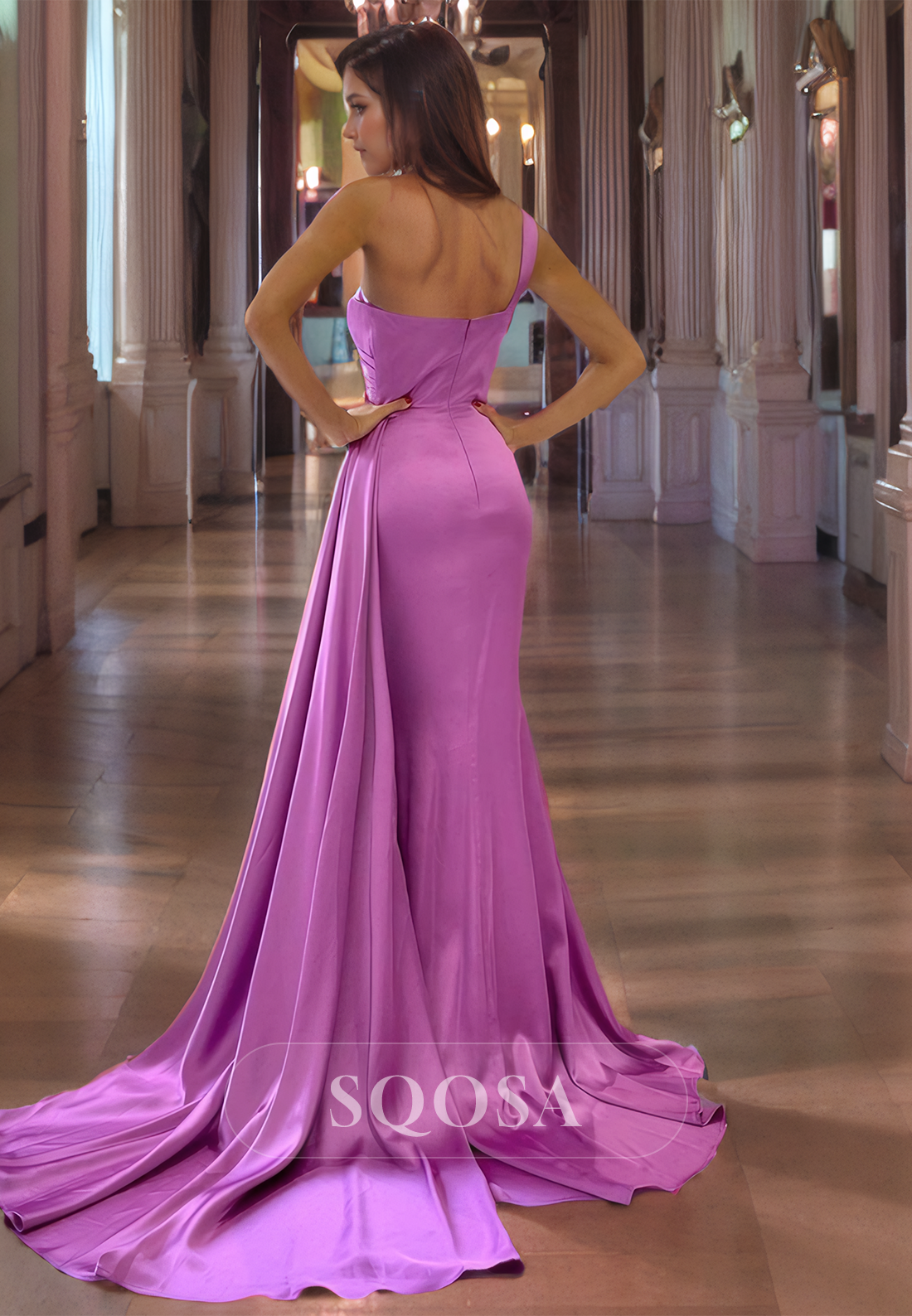 One Shoulder Satin Ruched Mermaid Formal Evening Dress with Train