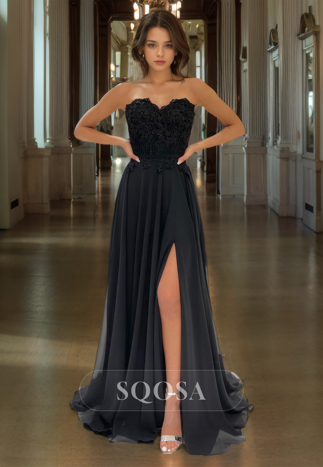 A Line Sweetheart Lace Beads Chiffon Black Formal Gown with Slit Long Prom Dress
