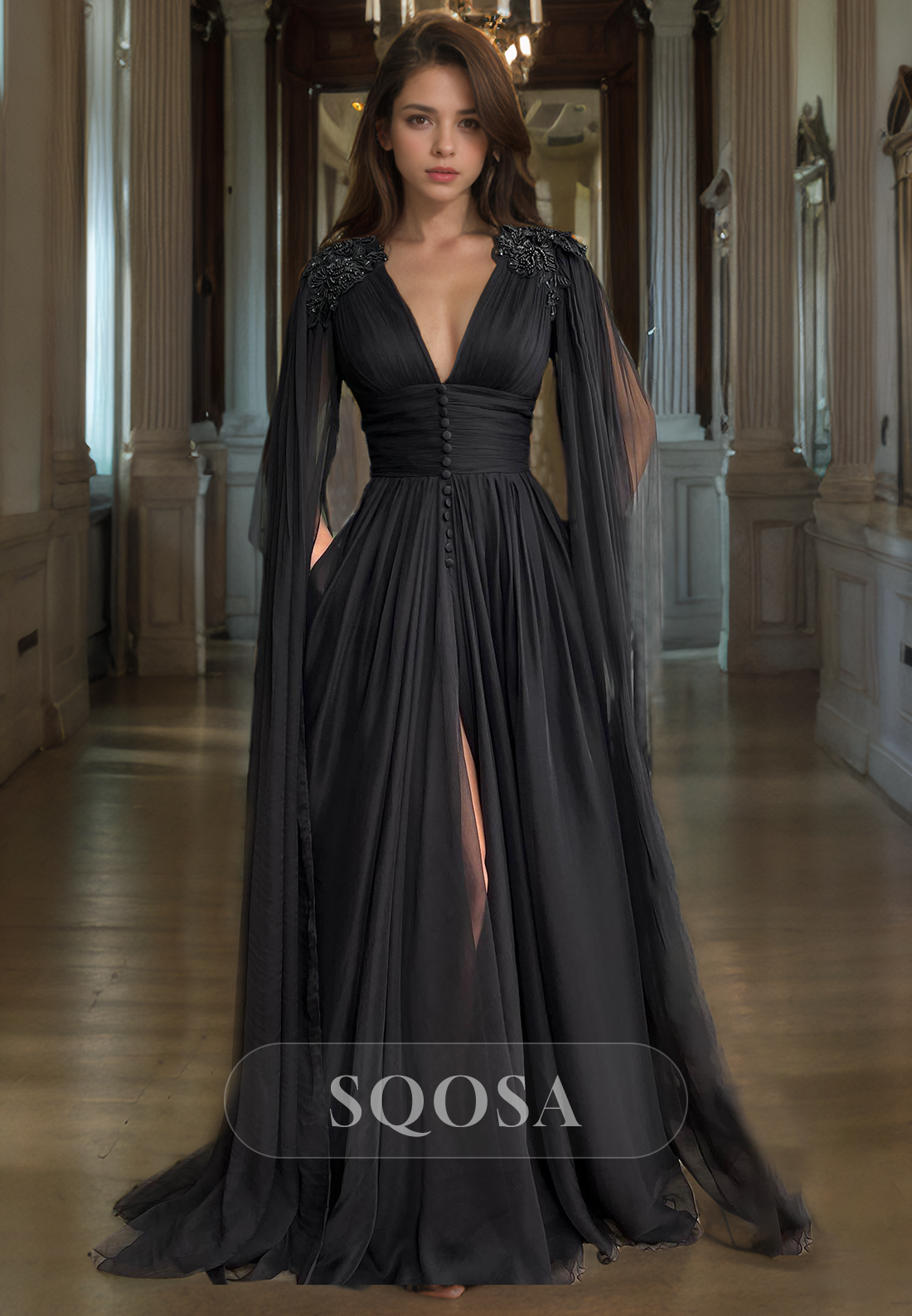 This A Line V Neck Chiffon Pleats Long Black Prom Dress with Pockets is perfect for any special occasion. The elegant V neck and pleats add sophistication, while the chiffon material is light and comfortable. With the added benefit of pockets, this dress combines style and practicality. Perfect for proms and parties.