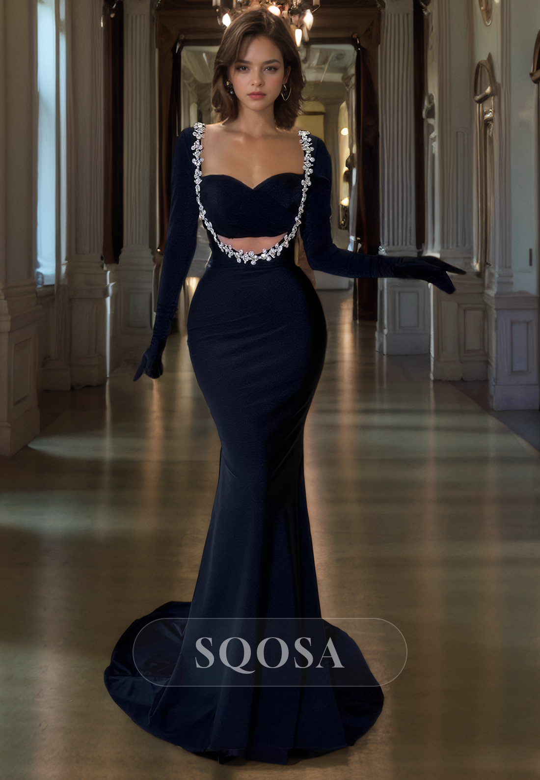 Mermaid Sweetheart Beads Black Velvet Long Sleeves Prom Dress with Train Formal Gown x 1;