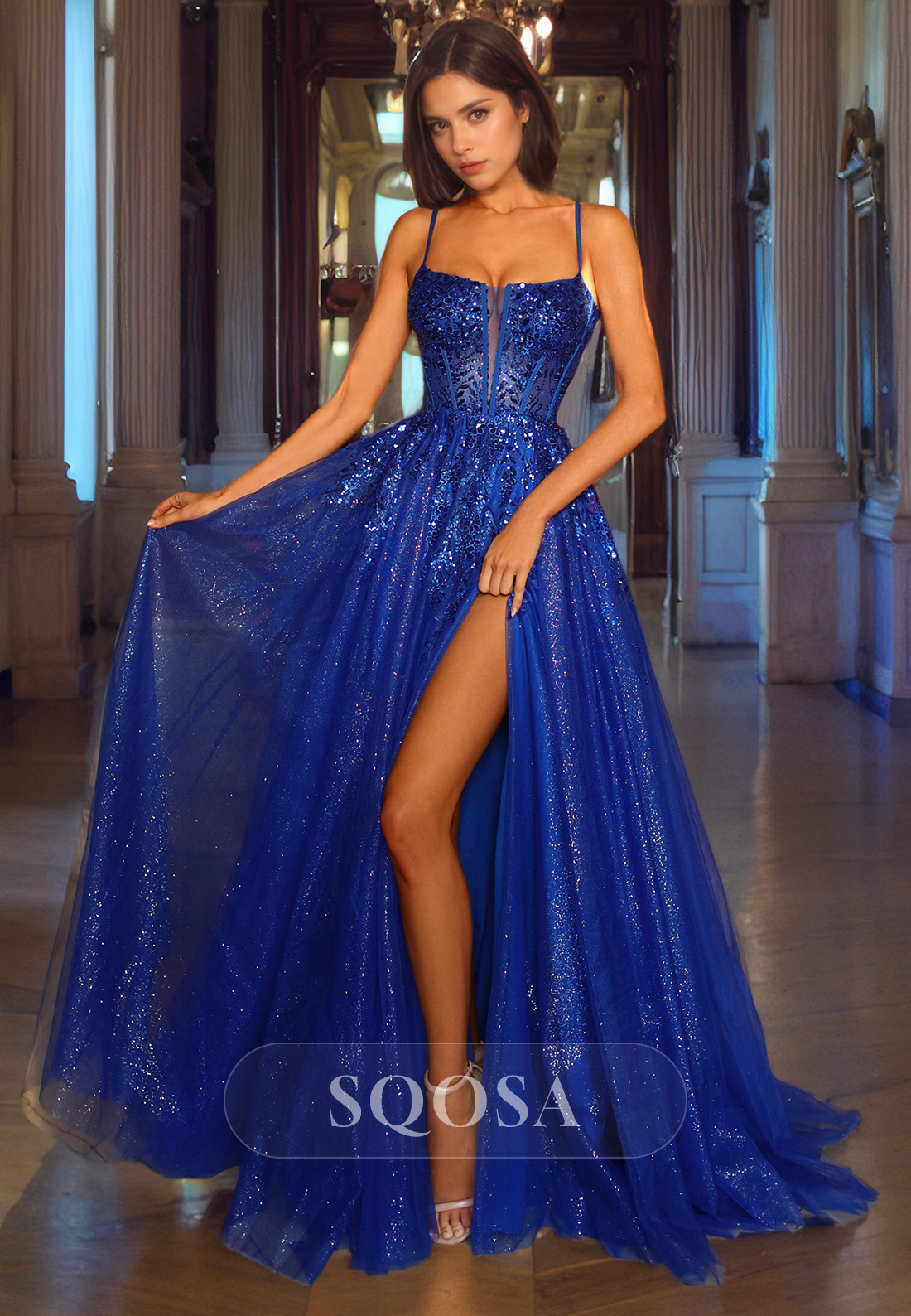 A line Plunging V neck Sequins Appliques Sparkly Prom Dress with Slit Formal Gown