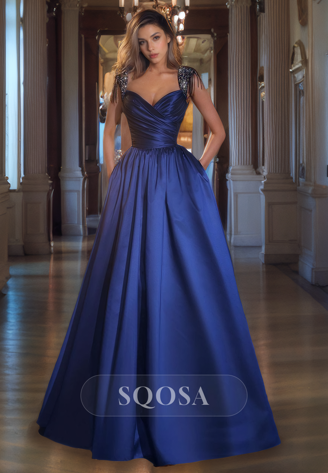 A Line Beads Straps Satin Pleats Long Prom Dress with Pockets Floor Length Party Gown