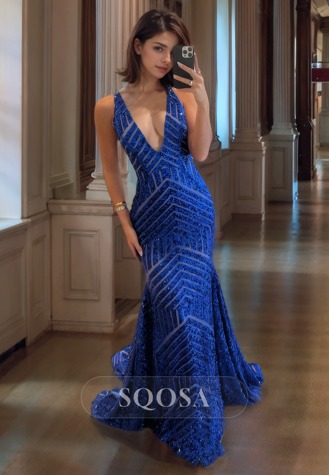 V-Neck Sleeveless Mermaid Prom Dress with Train Sequined for Fomal Evening Party