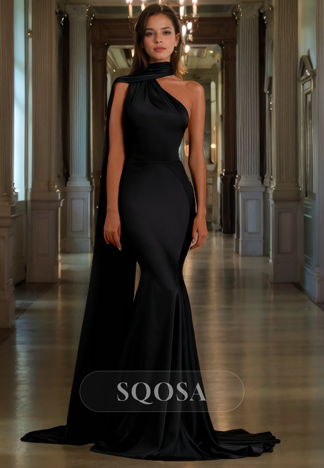 Prom Dress High Halter Sleeveless Mermaid Satin with Sweep Train for Formal Evening