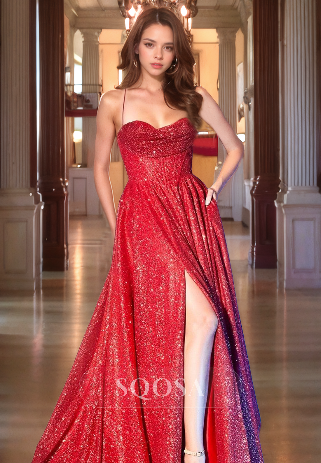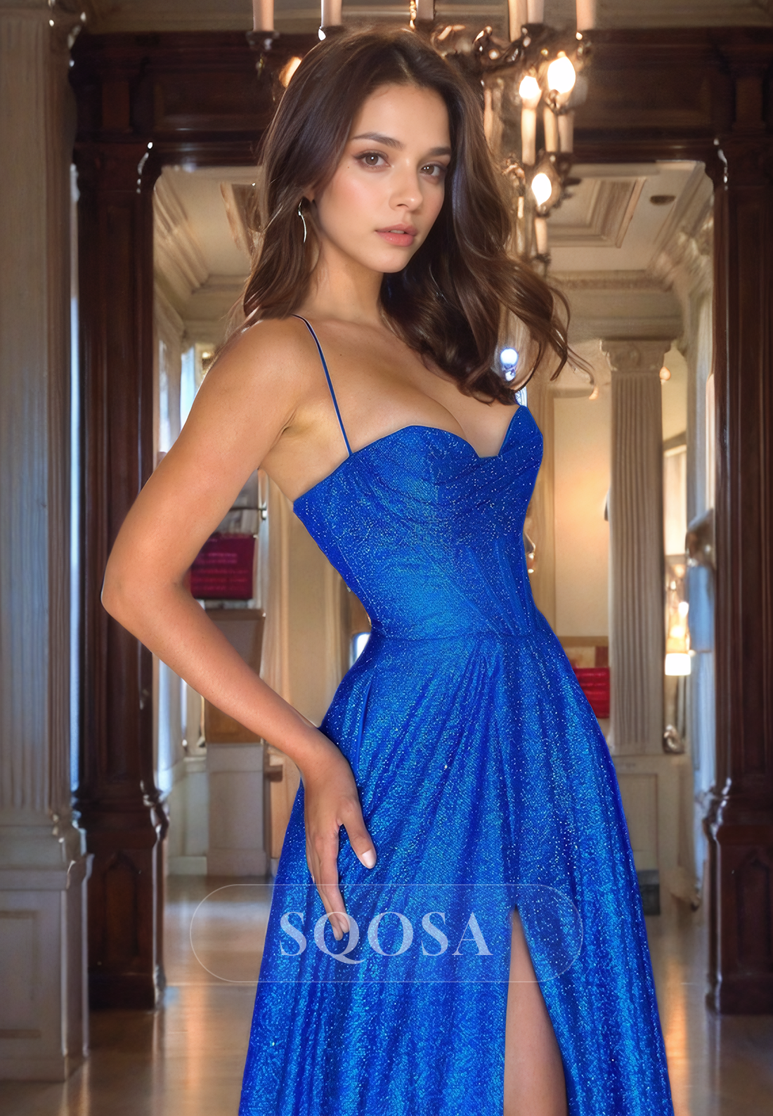 Sweetheart A-Line Spaghetti Straps Prom Dress Glitter-Knit Floor Length with Slit Party Gowns x 1;