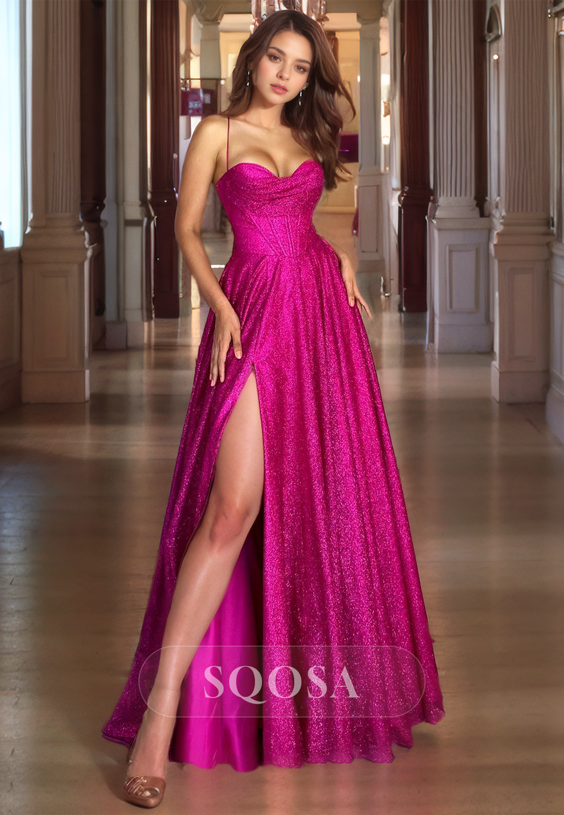 Elevate your prom look with our Sweetheart A-Line Spaghetti Straps Prom Dress. The glitter-knit fabric adds a touch of glamour, while the floor length design with a slit adds a hint of allure. The A-line silhouette creates a flattering shape, perfect for a party or special occasion.