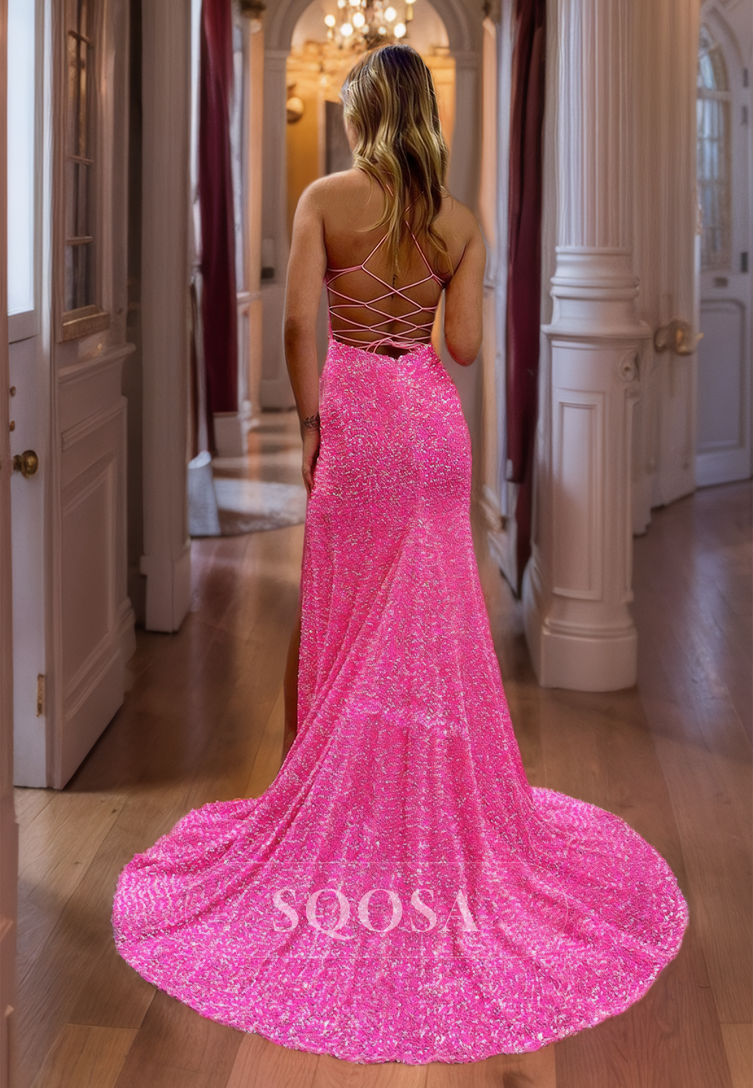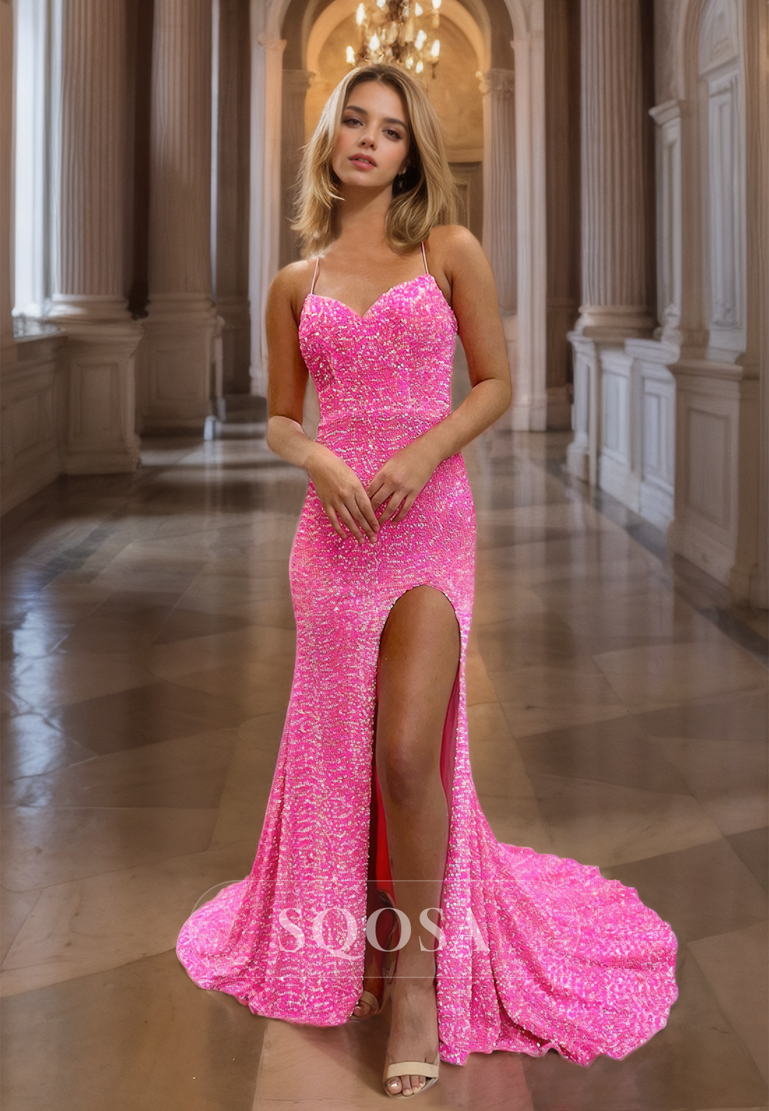 Sweetheart Spaghetti Straps Mermaid Prom Dress Glitter-Knit Slit Party Gowns with Train