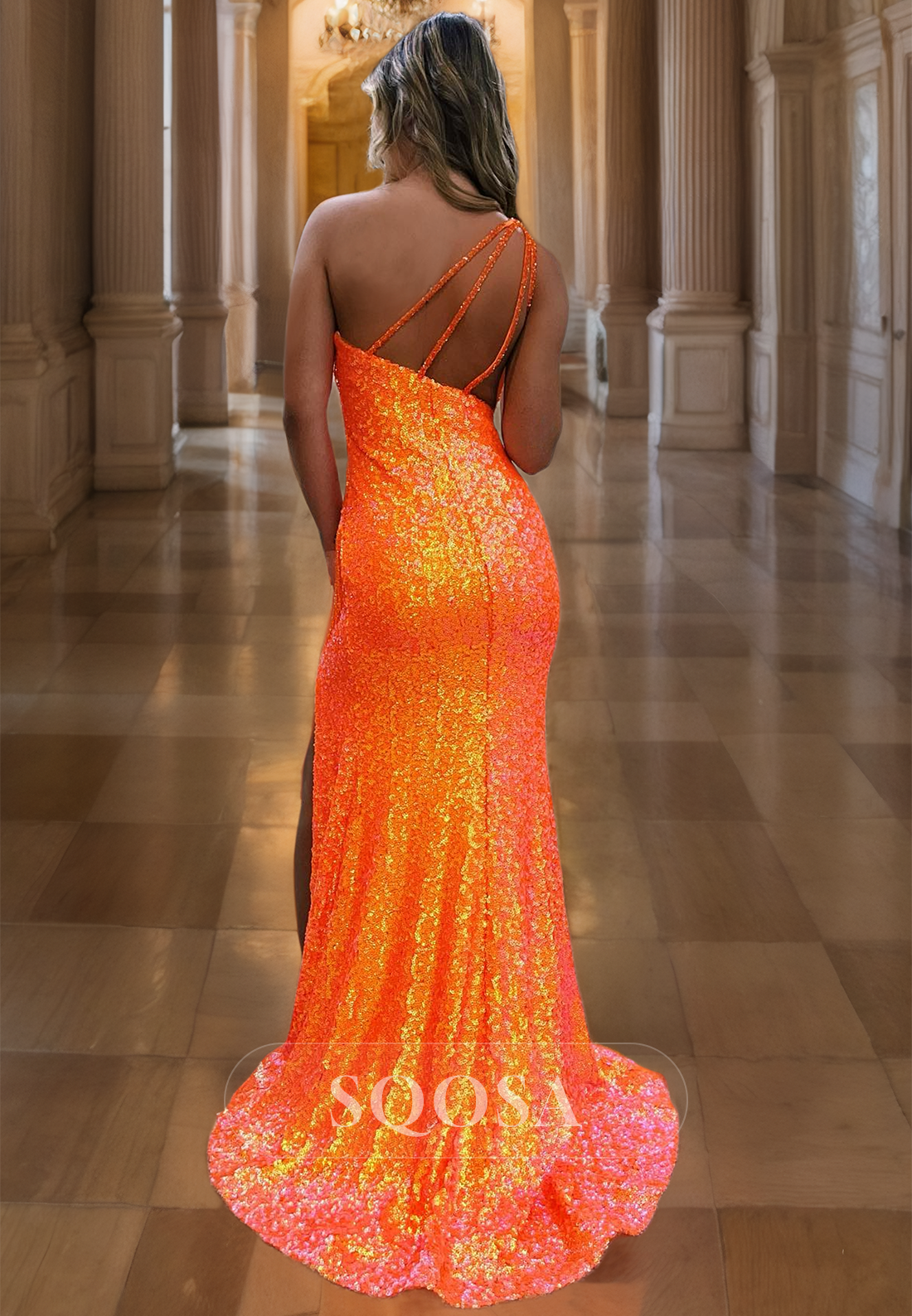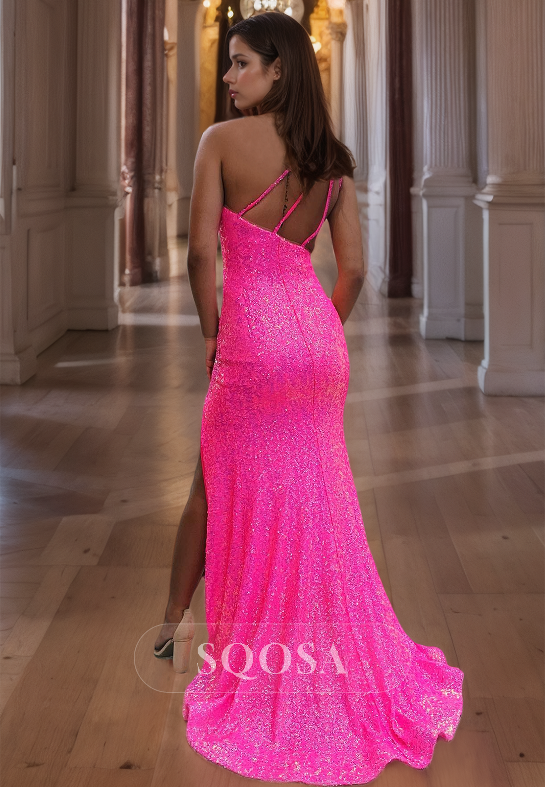 Elevate your style with our Allover Sequined Slit with Train Mermaid Prom Dress. Featuring an asymmetrical neck and sleeveless design, this glamorous evening gown will turn heads. The allover sequin embellishment and dramatic train add a touch of elegance. Make a statement and shine at your next event.