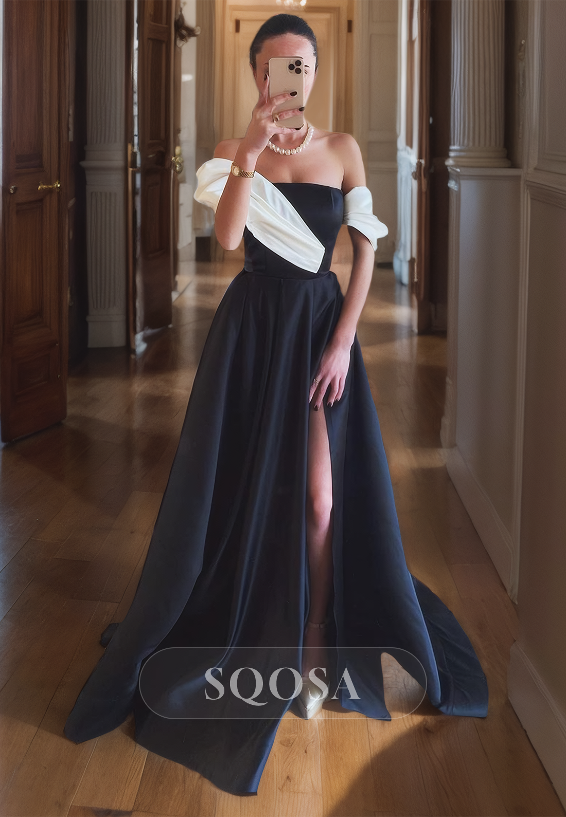 A-Line Sleeveless Tube Top Formal Gowns Pleated High Split Satin Prom Dress with Sweep Train x 1;