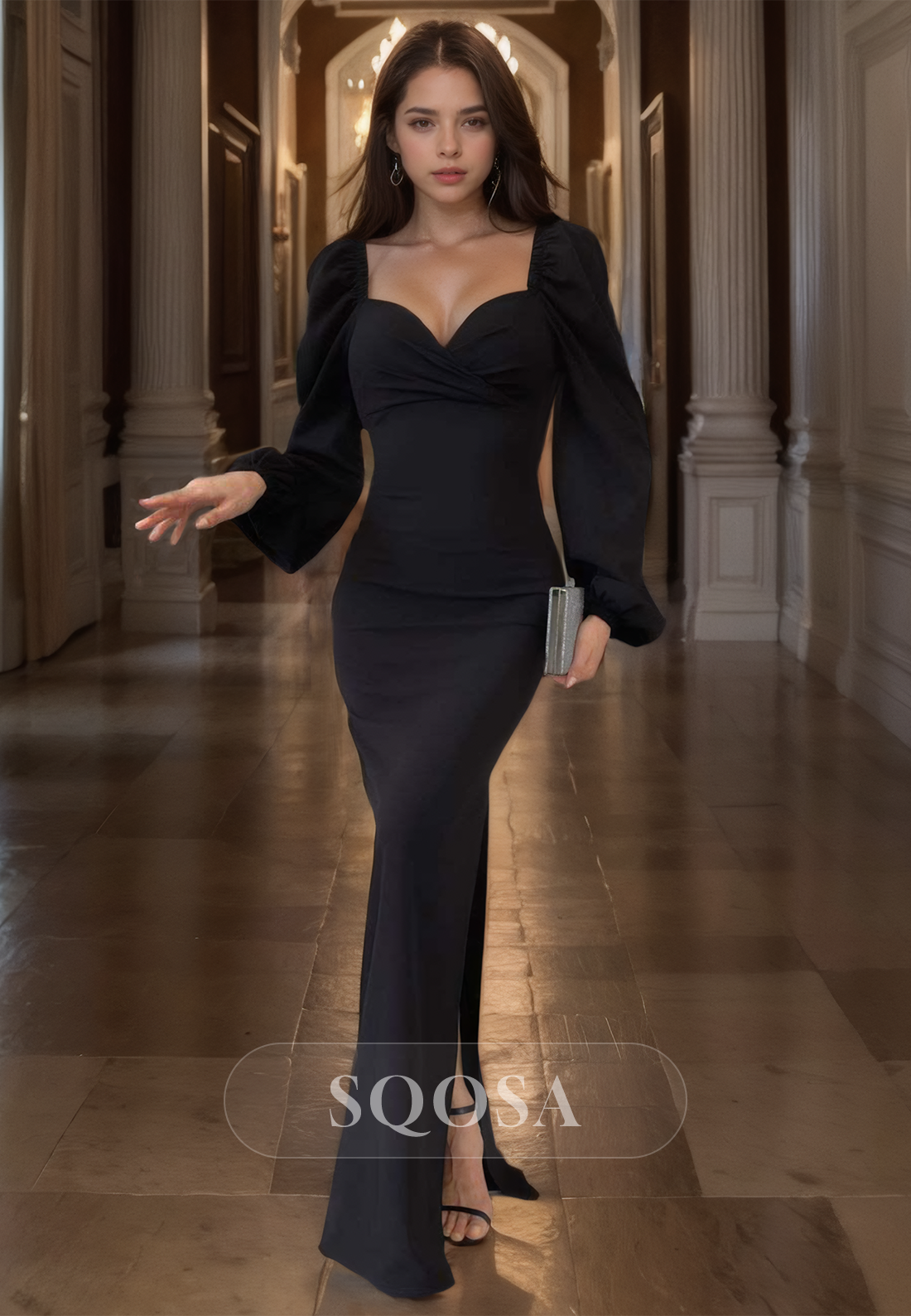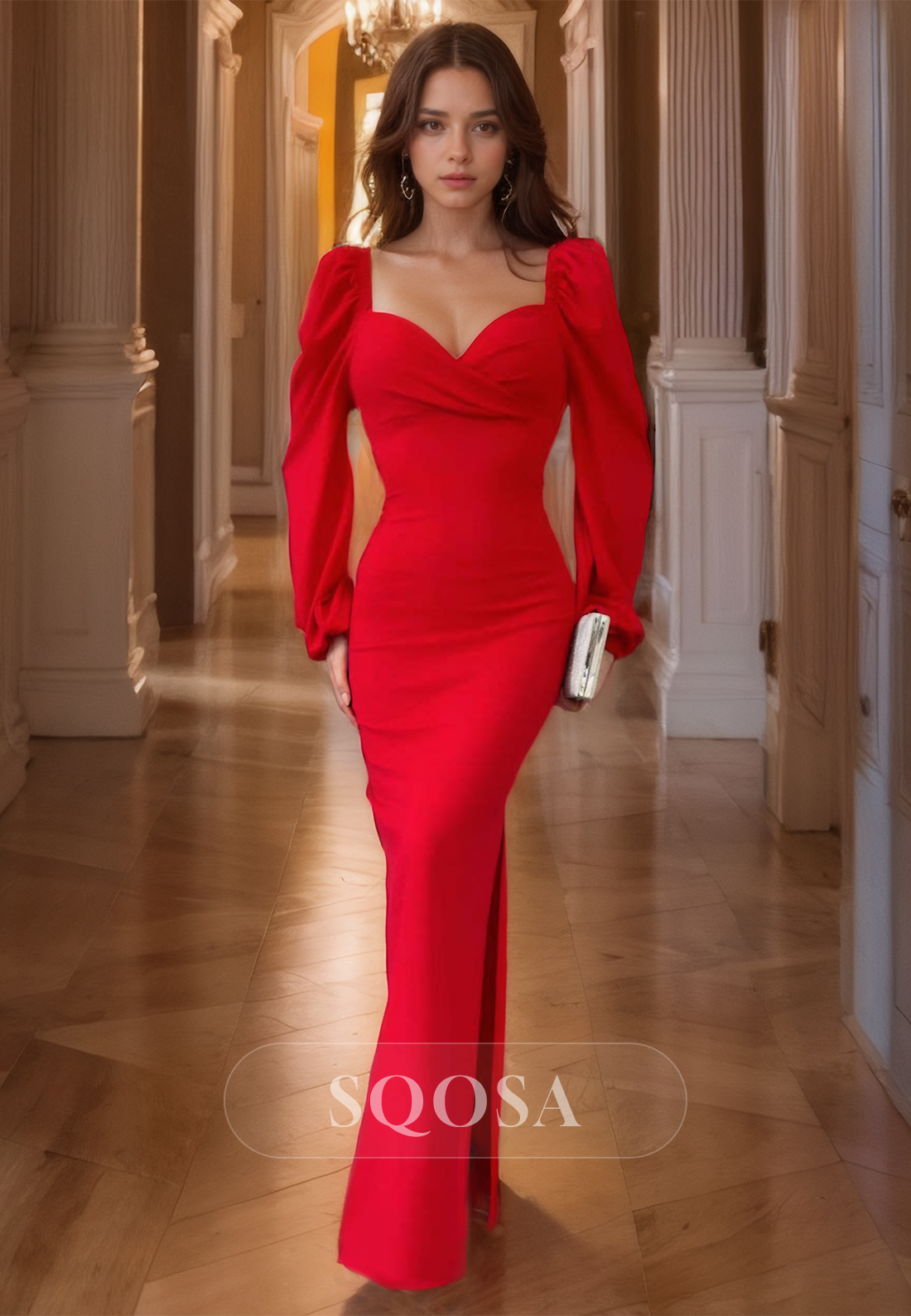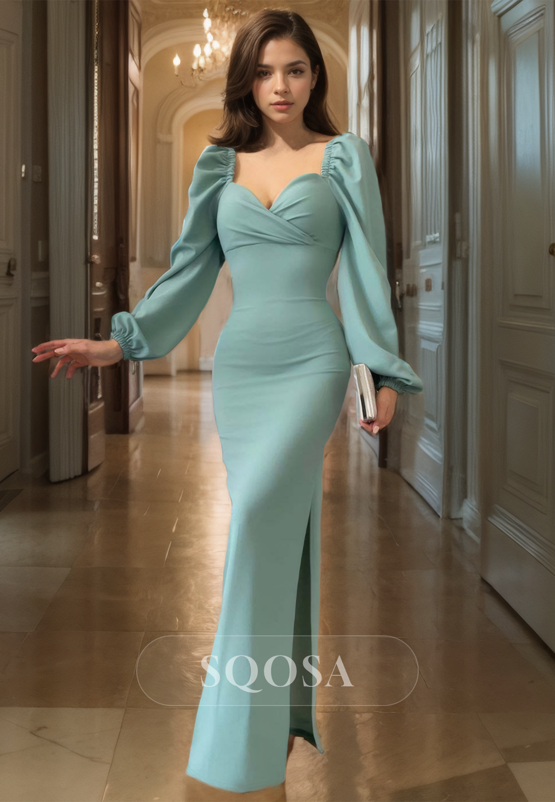 Simple Sweetheart Long Sleeves Mermaid Formal Gown Floor Length with Slit Satin Prom Dress