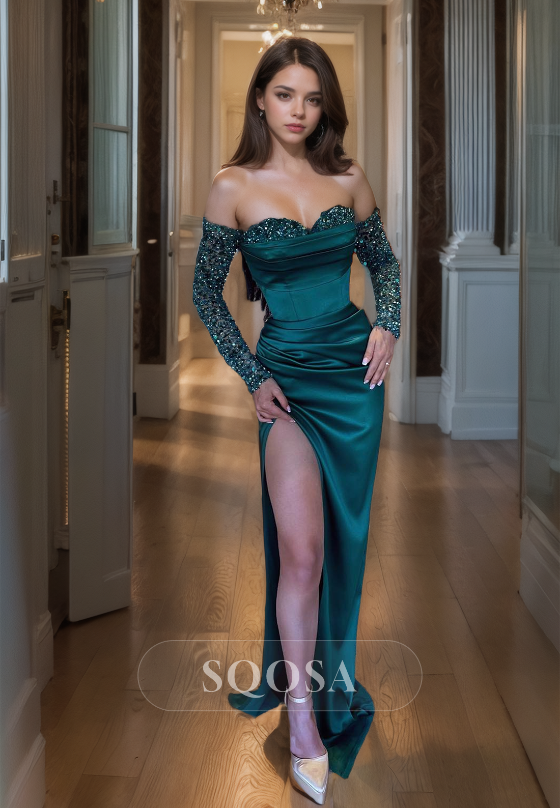 Long-Sleeves Sweetheart Sequined Mermaid Prom Dress Pleated Floor-Length Formal Gowns with High Slit
