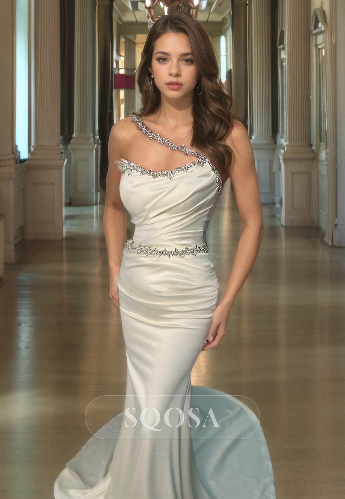 Asymmetrical-Neck Sleeveless Mermaid Dress Pleated and Beaded Trimmed Formal Prom Dress