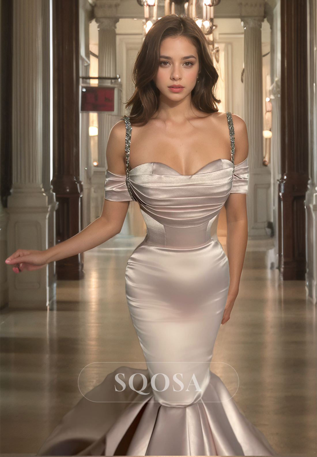 Sweetheart Spaghetti Straps Mermaid Prom Dress Pleated Satin Party Gowns with Beaded