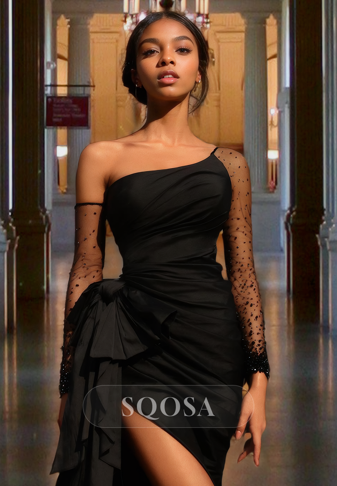 Asymmetrical-Neck Pleated Fitted Prom Dress Long Lace Sleeves Floor-Length Evening Gowns with Slit