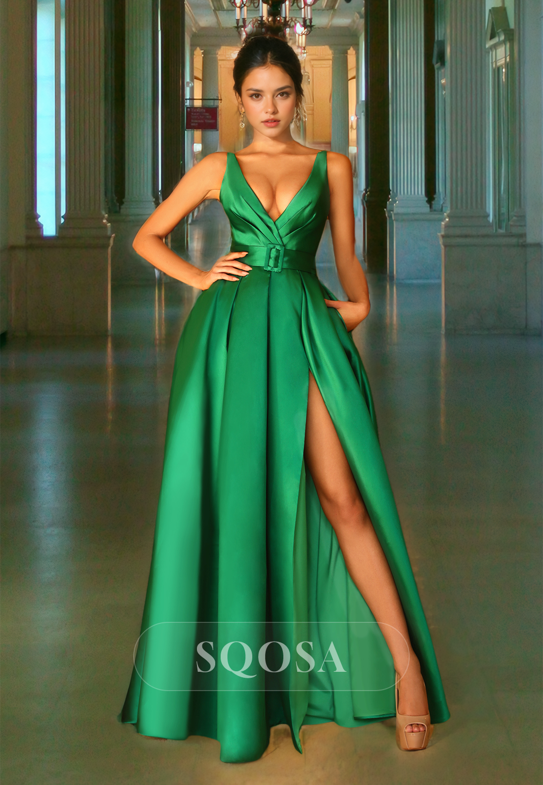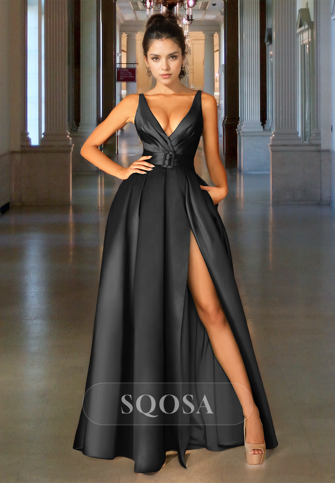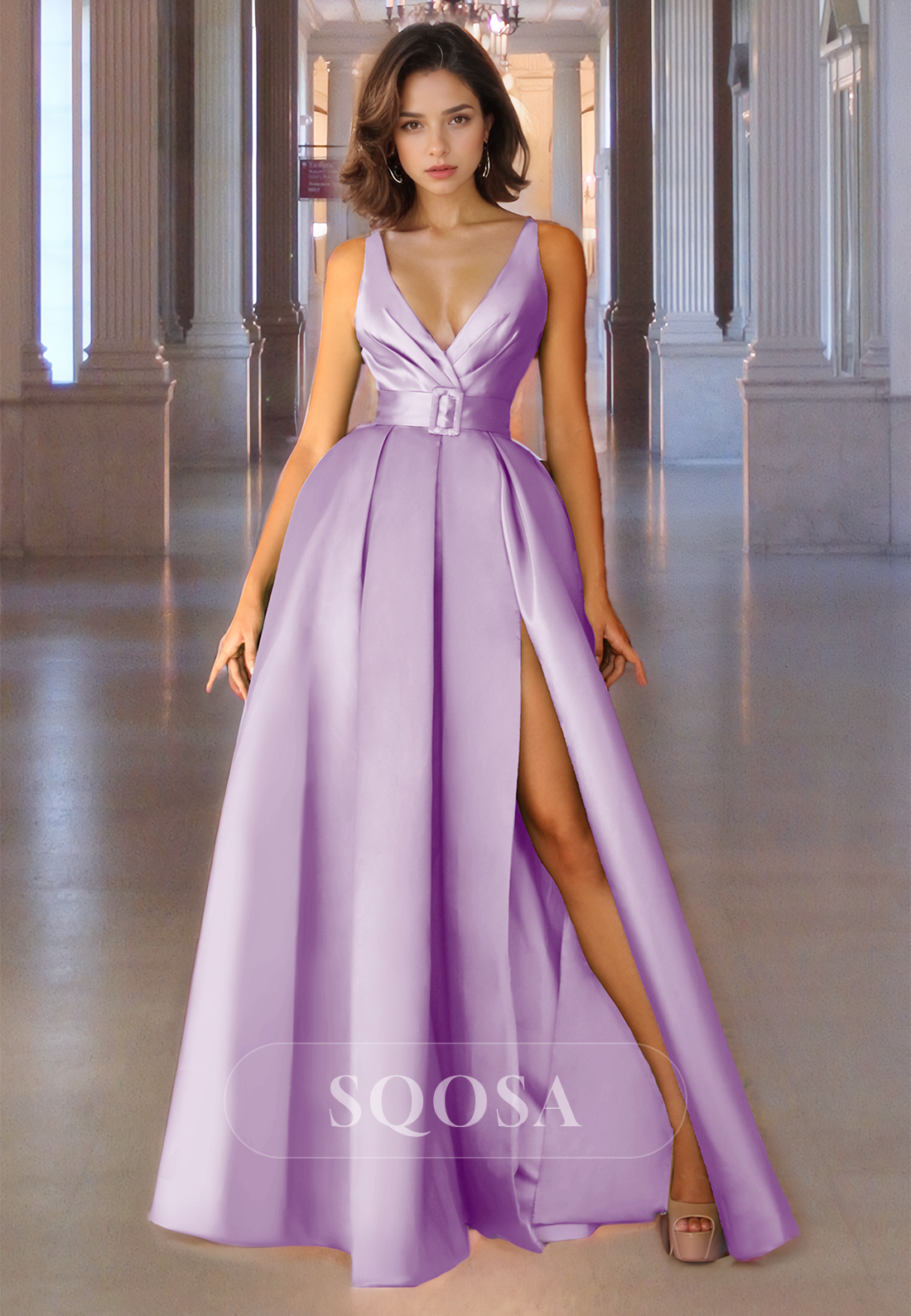 Simple V-Neck Straps Off-Shoulder Party Dress Pleated High Slit Satin A-Line Formal Prom Dress