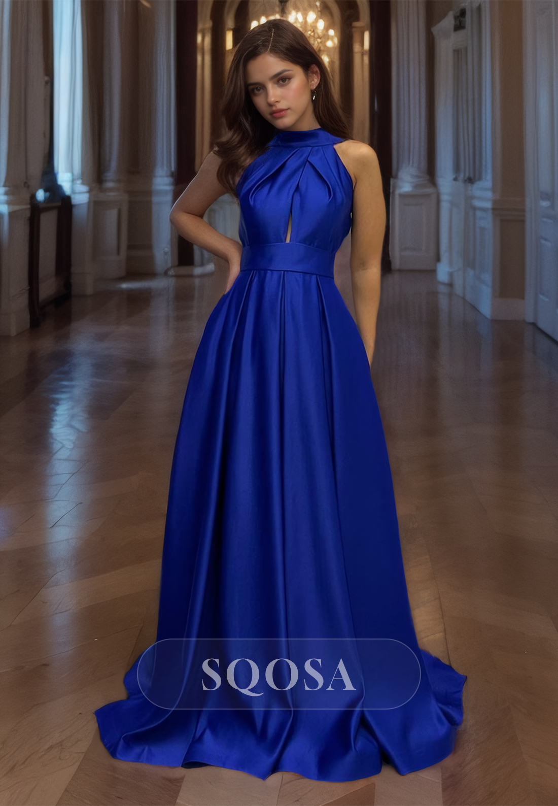 Halter-Neck Sleeveless Satin Formal Gowns Off-Shoulder Pleated Cutout A-Line Prom Dress x 1;
