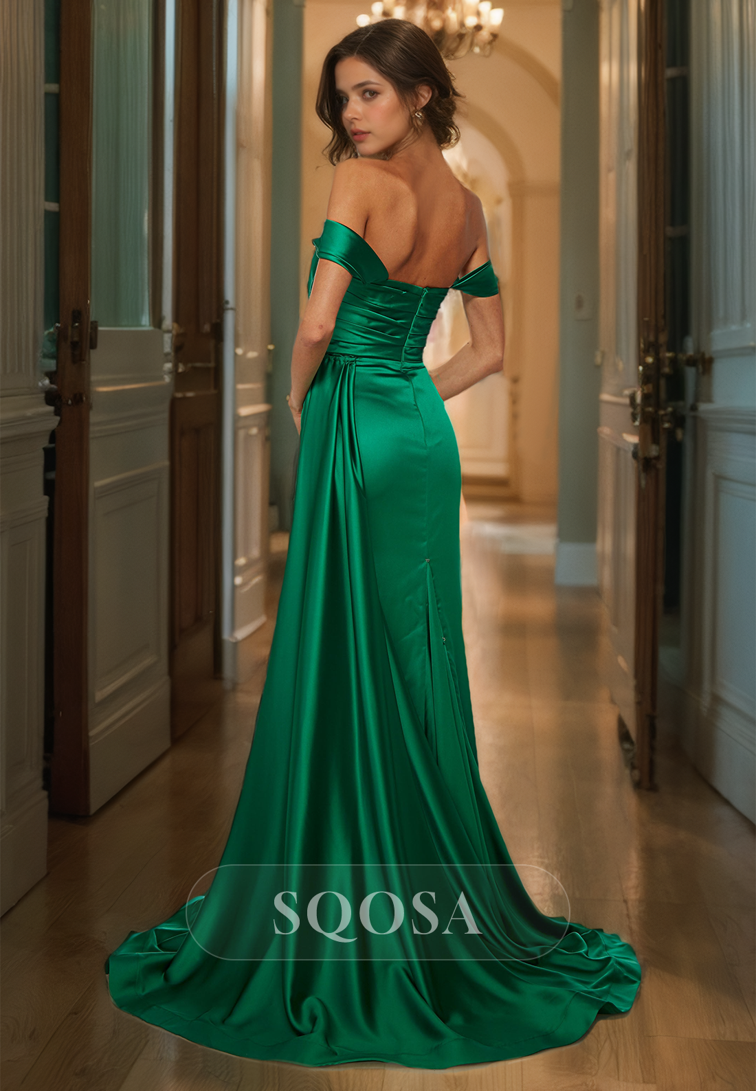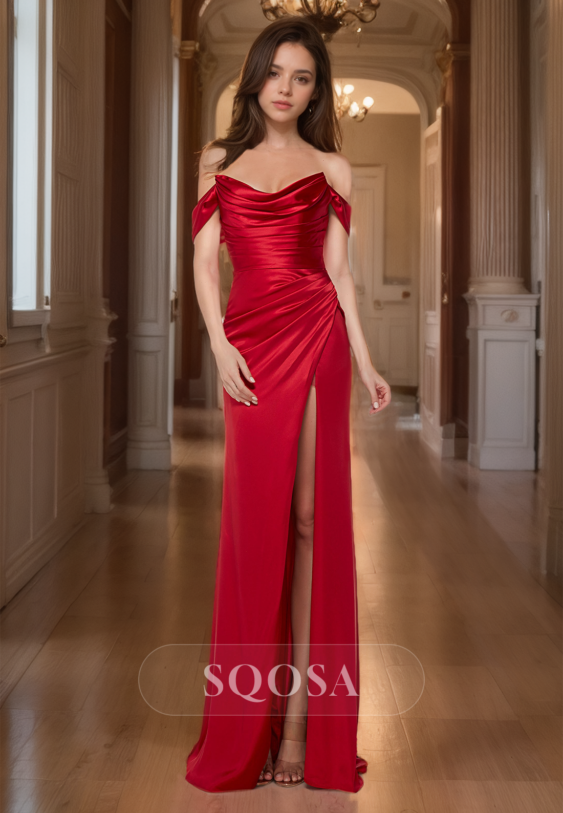 Simple Scoop-Neck Off-Shoulder Sleeveless Pleated High Slit Sweep Train Mermaid Prom Dress x 1;